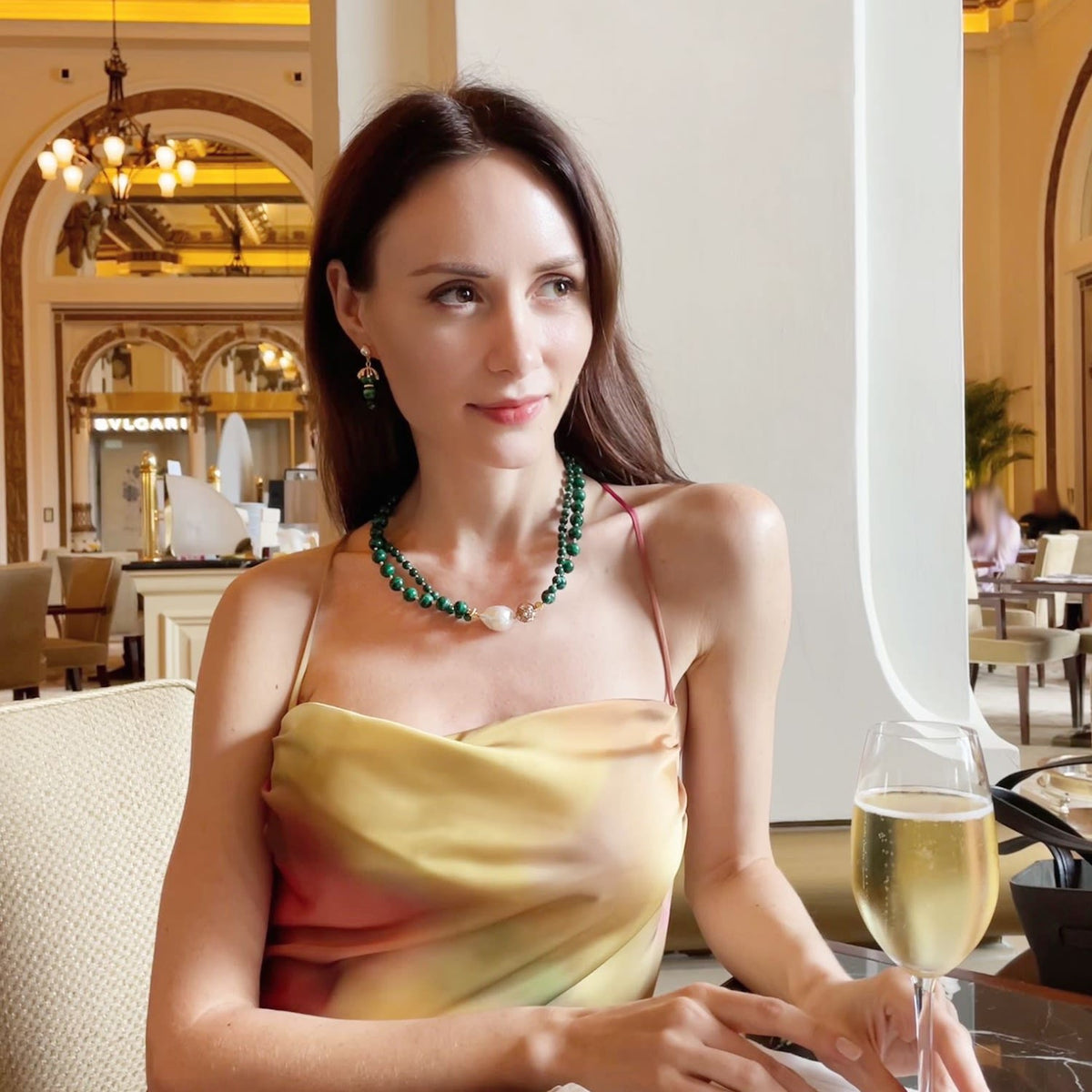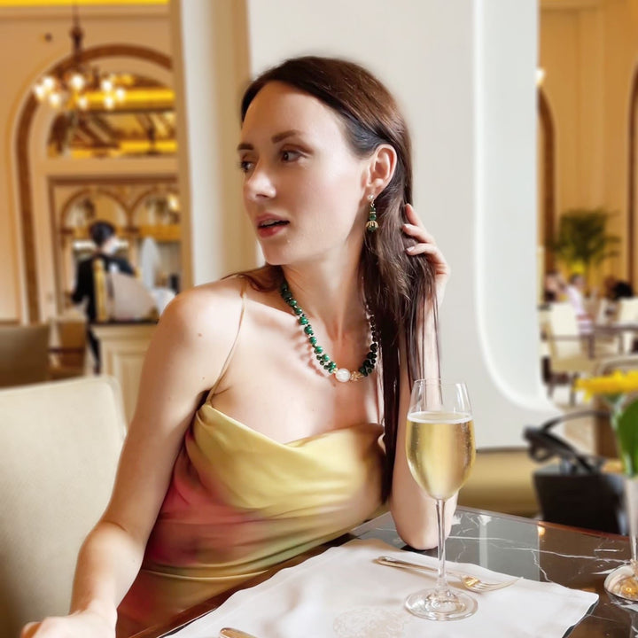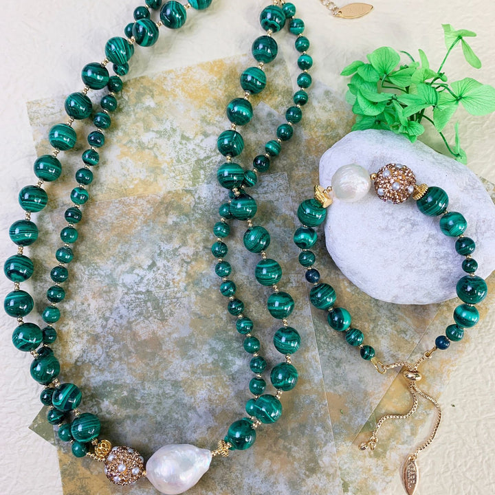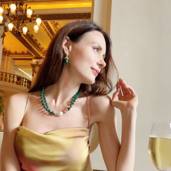 This handmade double-strand necklace is made of malachites, baroque pearls, and rhinestone-bordered pearls with golden-plated brass findings.