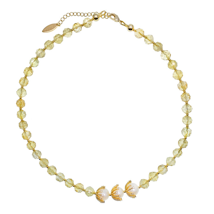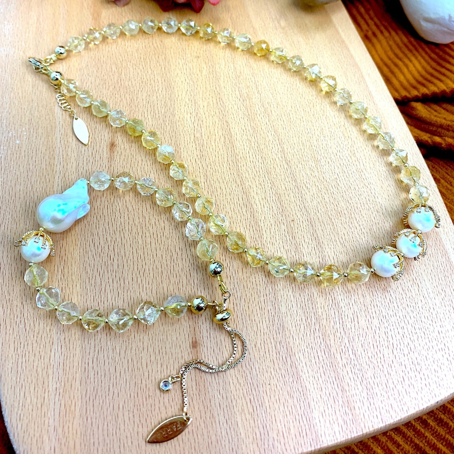 This handmade necklace is made of citrine and freshwater pearls with Japan golden-plated brass findings. It is designed as a short necklace and comes in a jewelry box for storage.