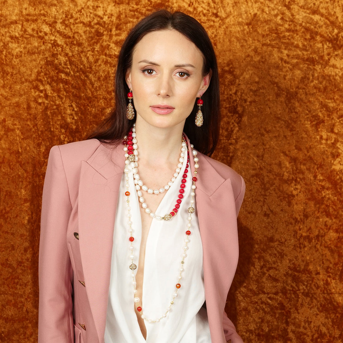 These handmade earrings are made of red coral and feature teardrop rhinestones bordered by pearls. The findings are made of Japan golden-plated brass. They are packaged in a jewelry box.
