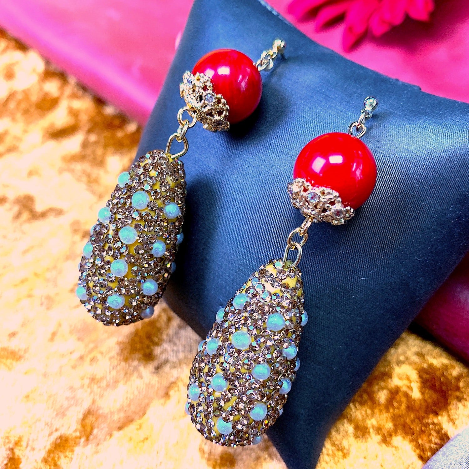 Red Coral With Teardrop Rhinestones Statement Earrings