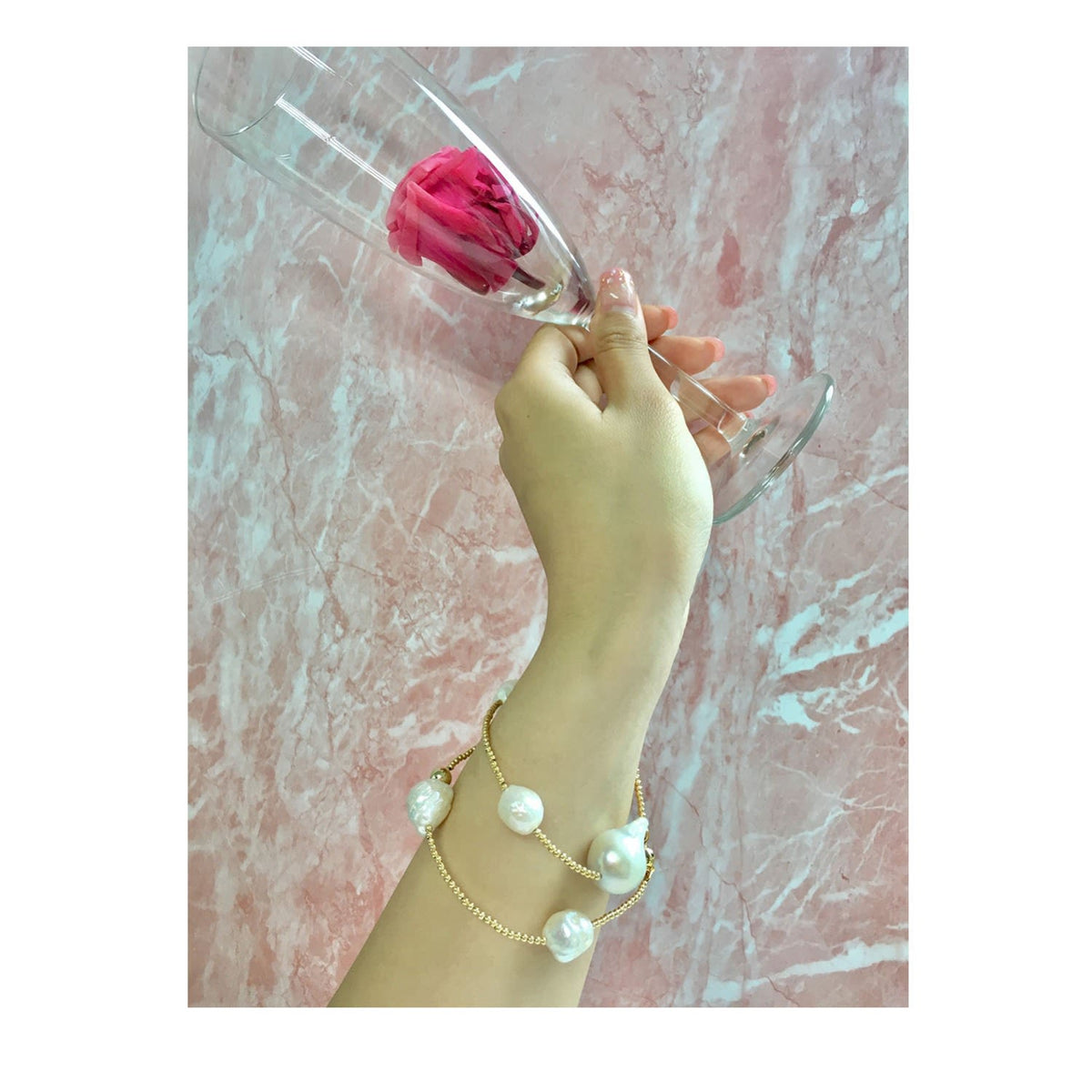 This brilliant bracelet is made of natural baroque freshwater pearls with gold-plated brass findings. It is designed to be double-wrapped. It comes in a nice jewelry case.