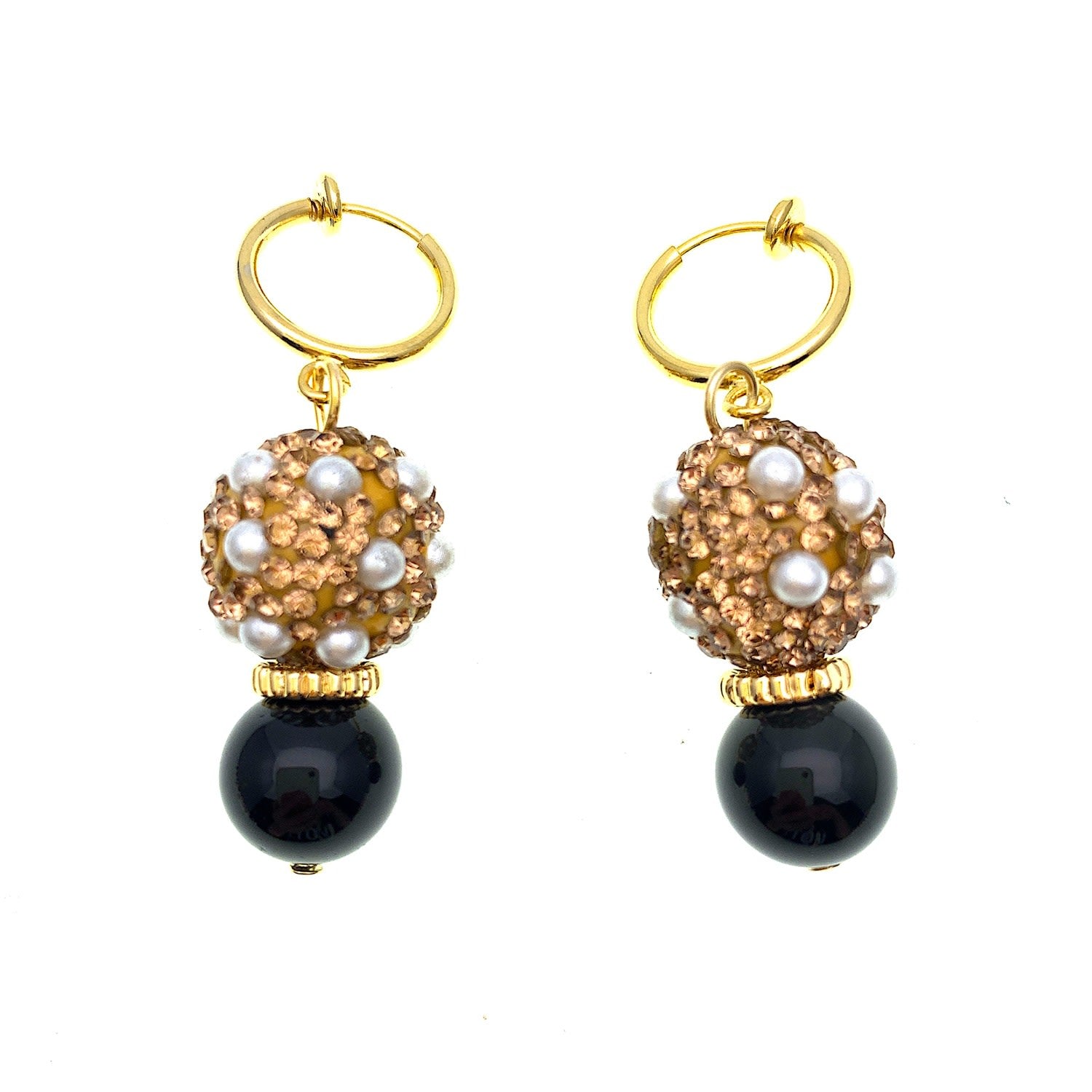 These handmade clip-on earrings are made of obsidian and features pearls bordered with round rhinestones. The findings are made of Japan golden-plated brass. They are packaged in a jewelry box.