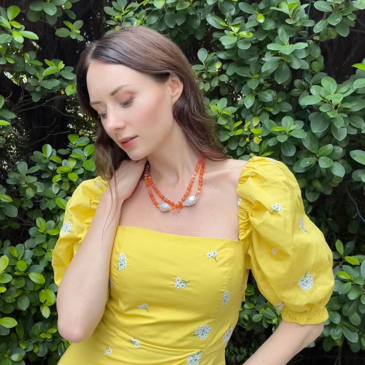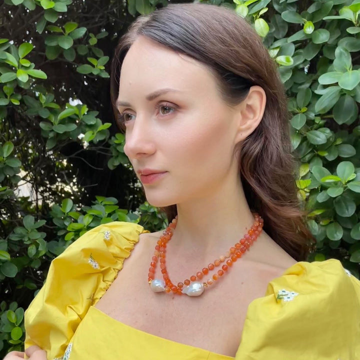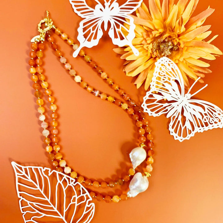 This handmade double-strand necklace is made of orange agate and baroque pearls. It features Japanese golden-plated brass findings. It comes in a jewelry box for storage.