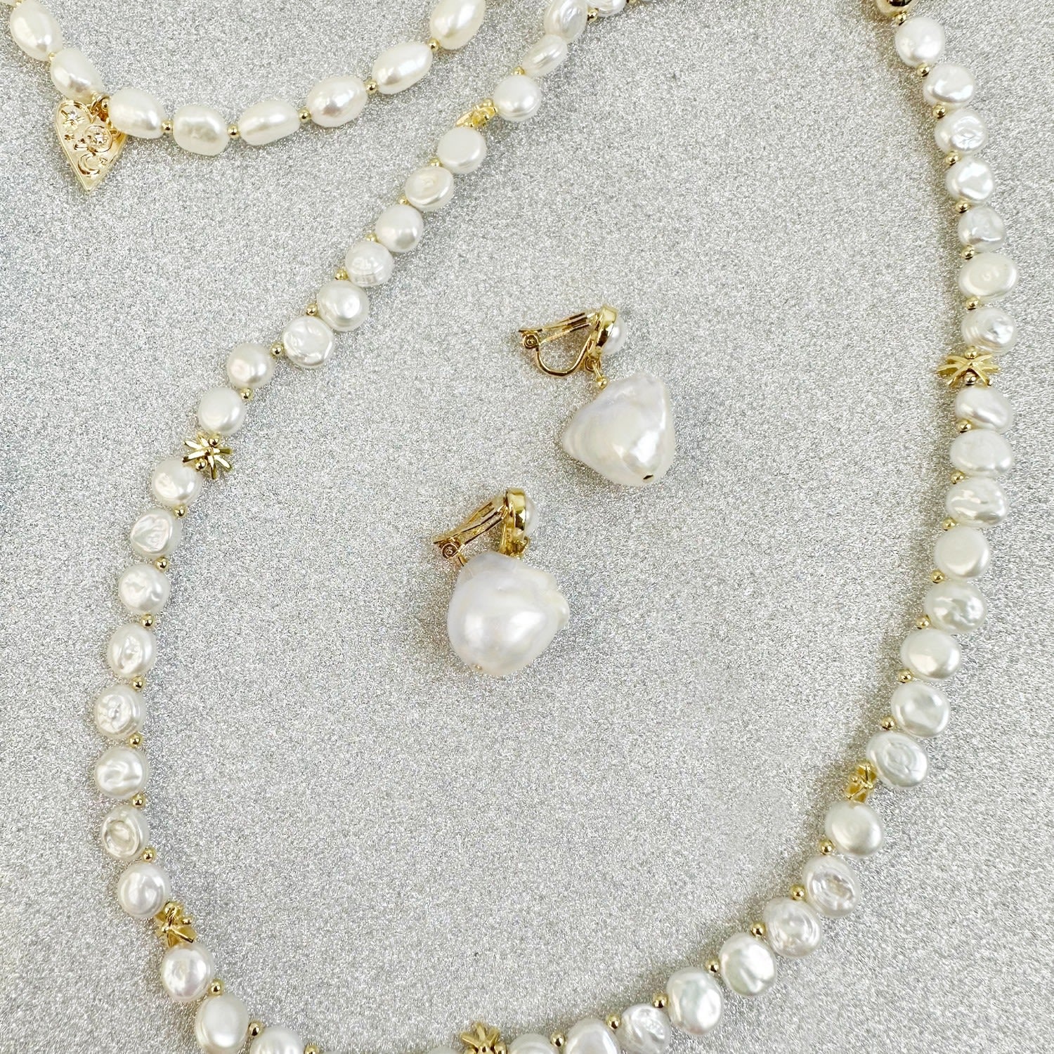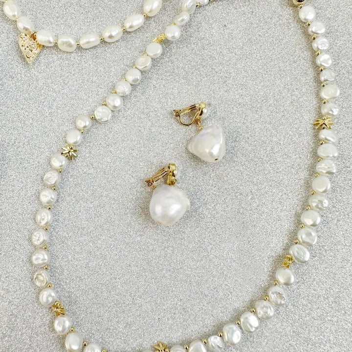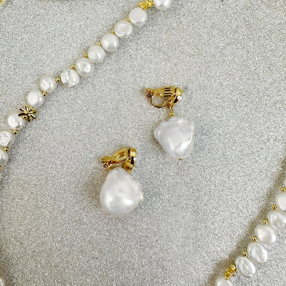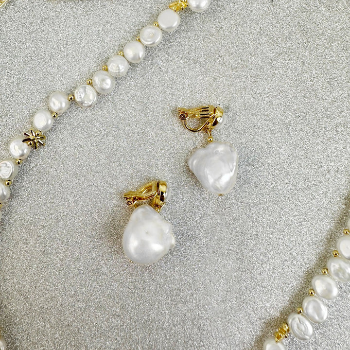 These clip-on earrings are crafted with freshwater baroque pearls. To maintain their quality, avoid contact with harsh chemicals such as perfumes, lotions, and hairsprays.
