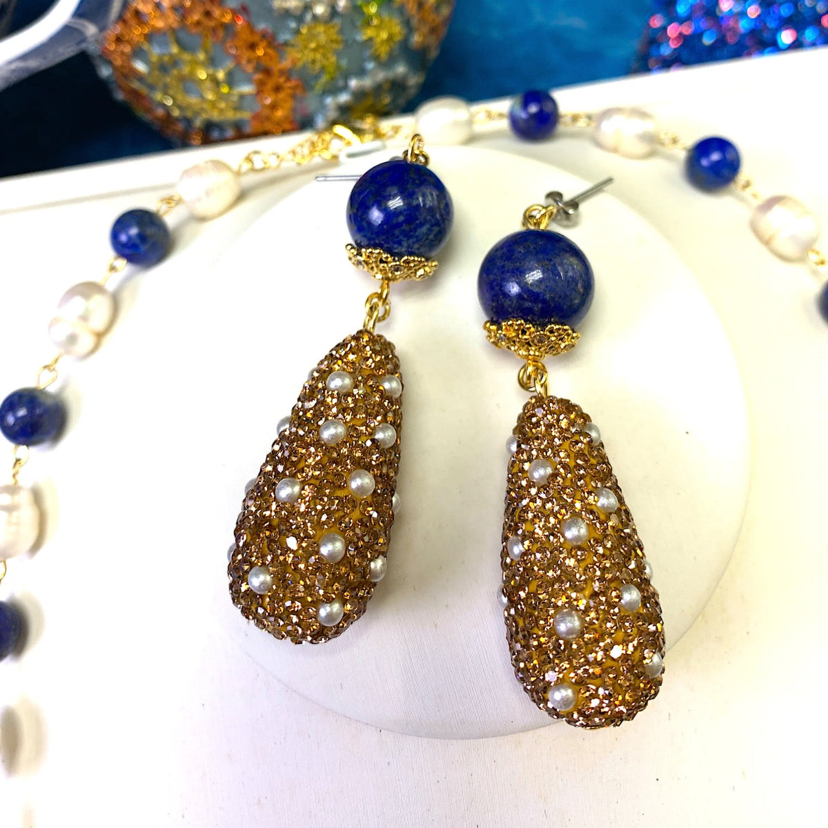 These handmade earrings are made of round lapis and rhinestones bordered pearls with Japan golden-plated brass findings. They come in a jewelry box.