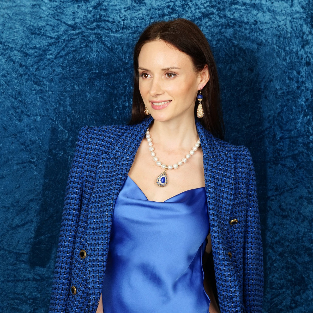 These Round Lapis - Rhinestones Bordered Pearls Dangle - Earrings by Farra are an elegant and classic accessory. The handmade earrings feature round lapis stones with rhinestones bordered pearls, creating a sophisticated and timeless look. These are a perfect gift for any special occasion and can be matched with a Farra necklace to complete your look.