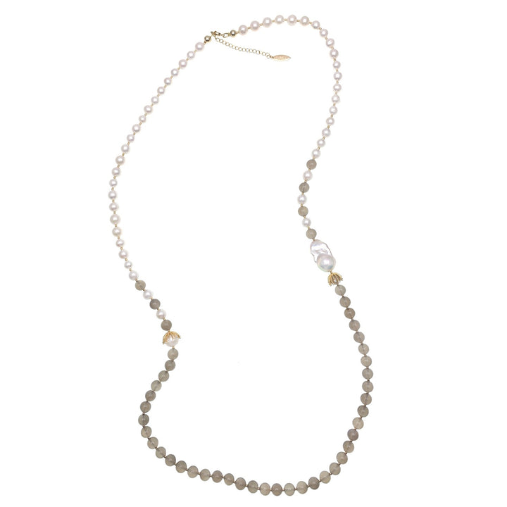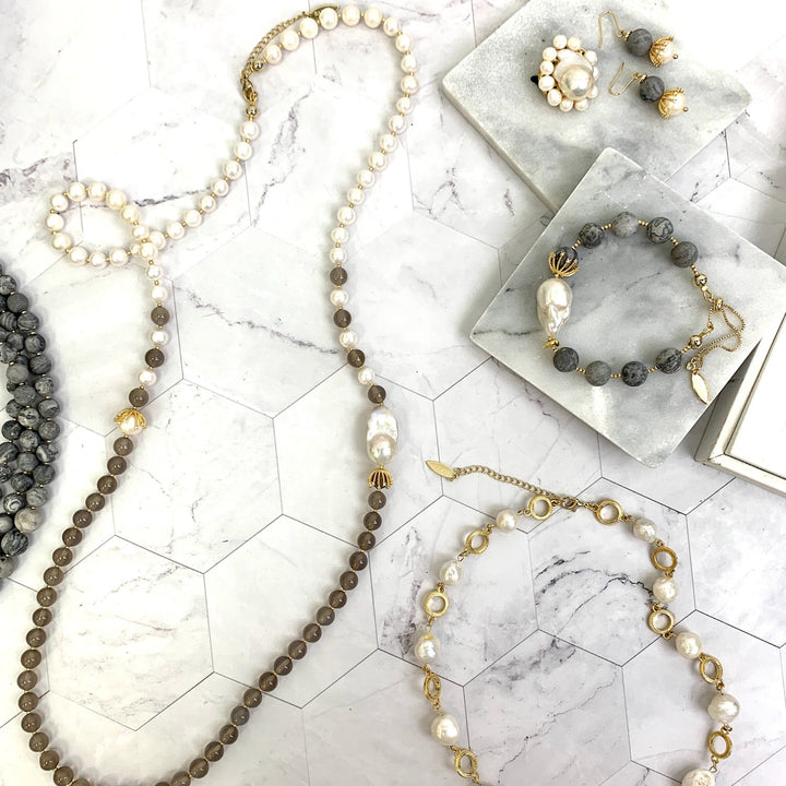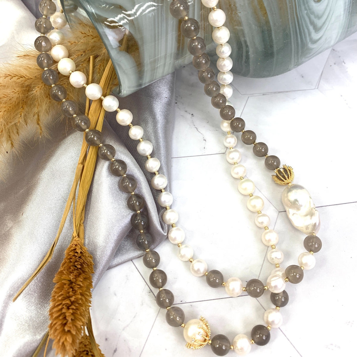 Freshwater Pearls And Gray Agate With Baroque Pearls Long Necklace