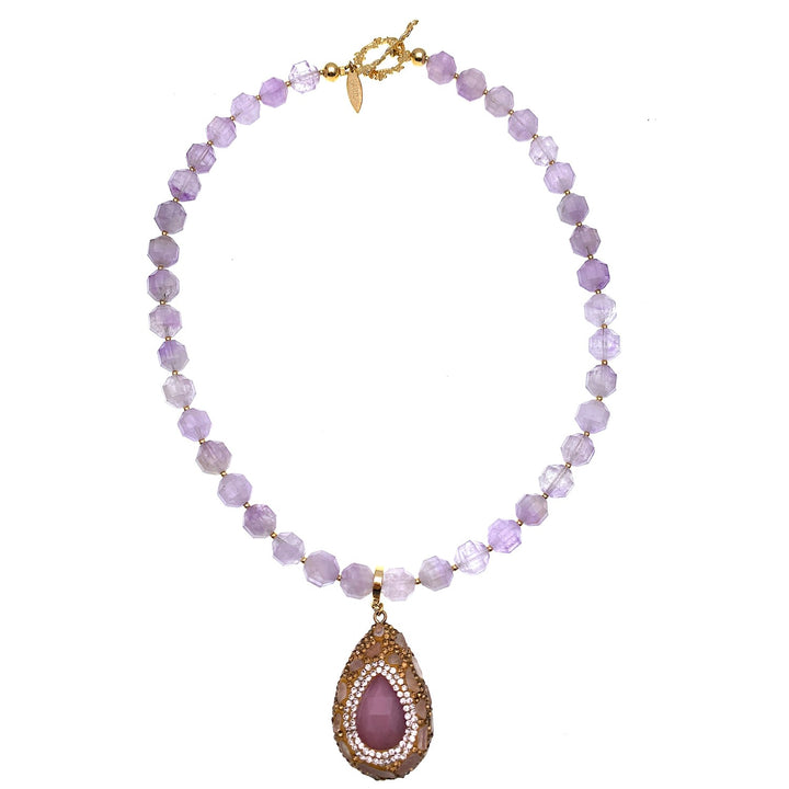 This handmade necklace is crafted from amethyst stones with a removable rhinestones bordered amethyst charm and golden-plated brass findings from Japan. It comes in a nice jewelry box.