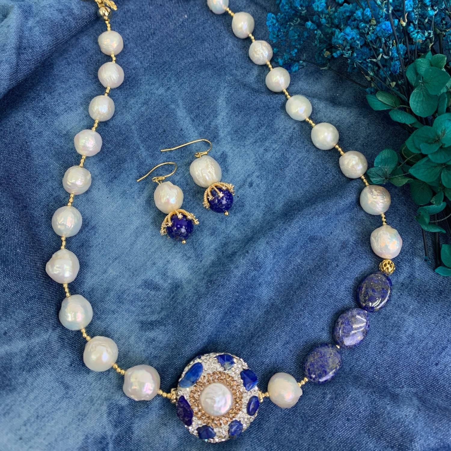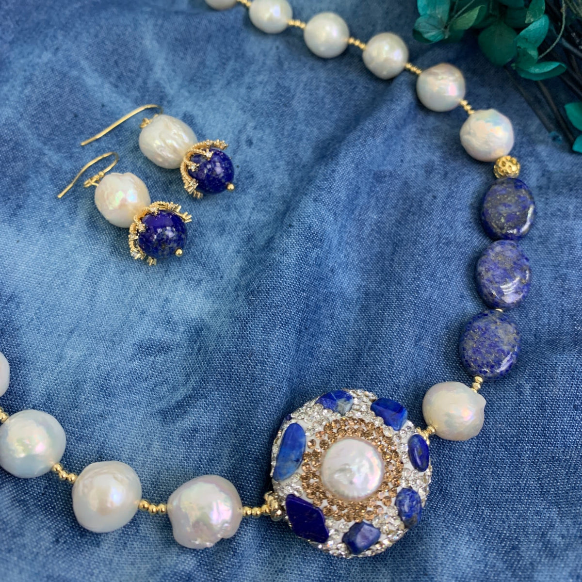 This handmade necklace features irregular freshwater pearls with lapis, a rhinestone bordered pearl, and Japan golden-plated brass findings. It has a magnetic closure and comes in a nice jewelry box.