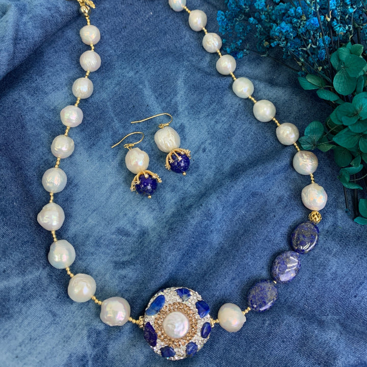 Irregular Pearls With Lapis Rhinestone Short Necklace