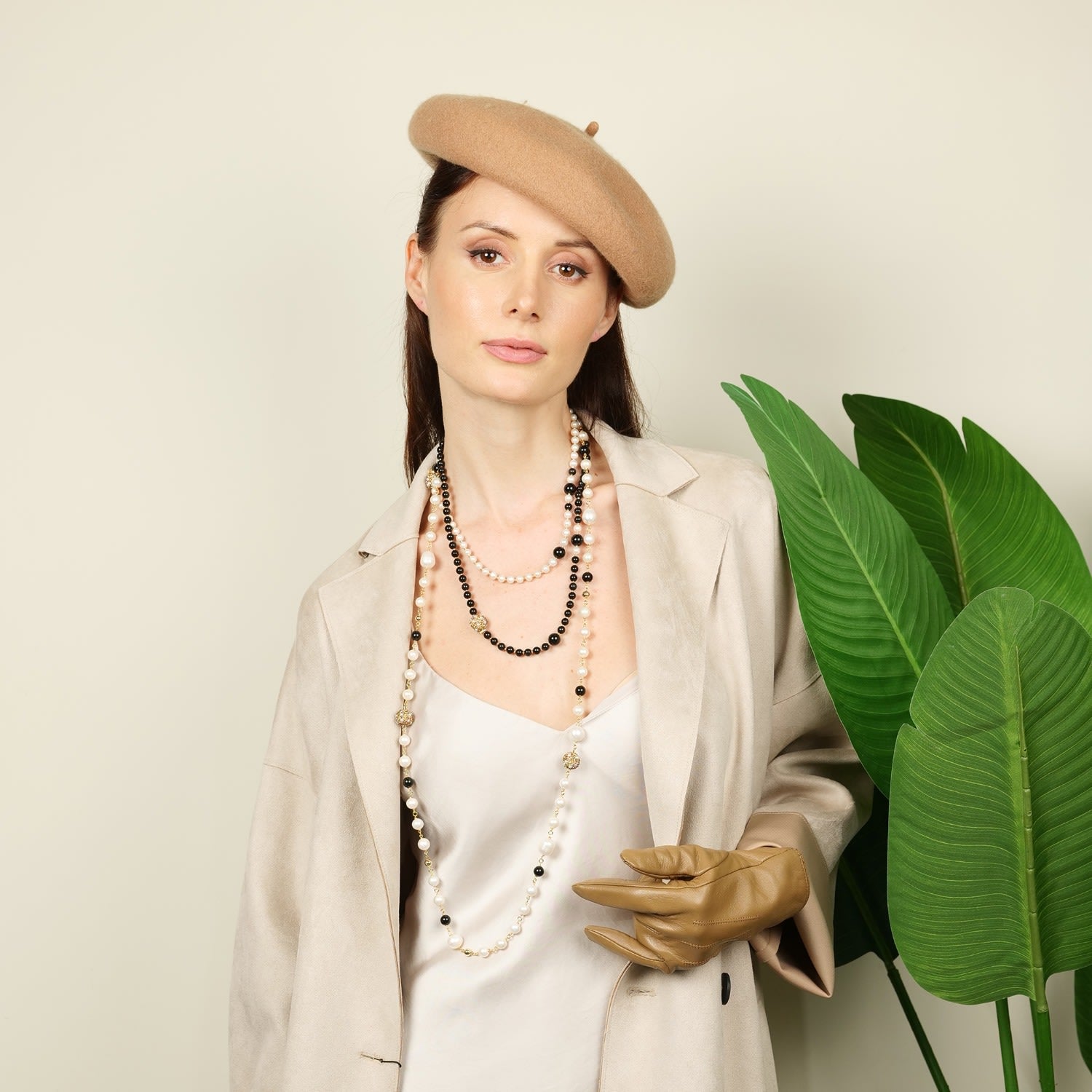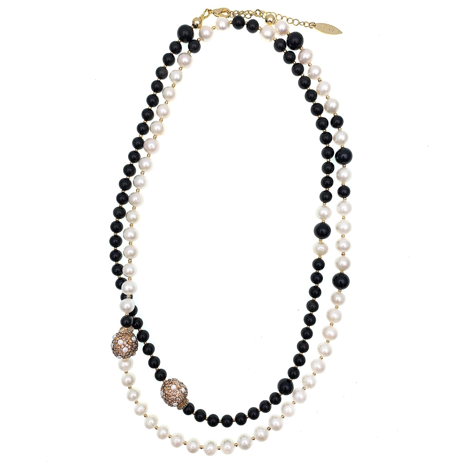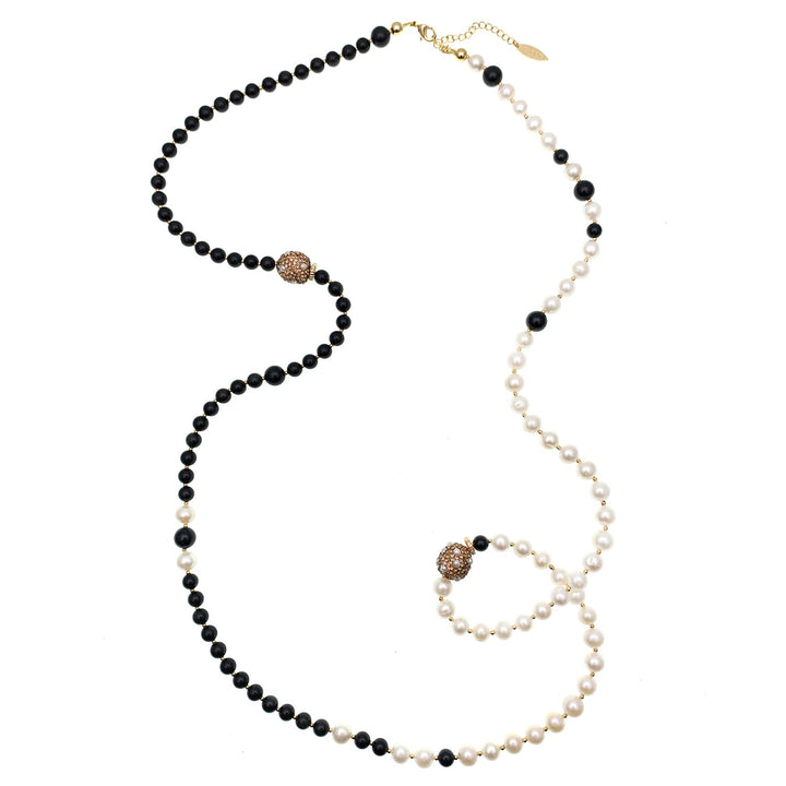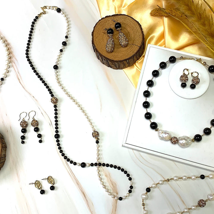 This Freshwater Pearls With Obsidian Statement Long Necklace by Farra is a timeless and elegant accessory. This handmade necklace is made of freshwater pearls, Obsidian, rhinestones bordered pearls, and Japan golden plated brass findings. The black and white color combination is perfect for wearing as a single long necklace or double-wrapped as a short necklace.
