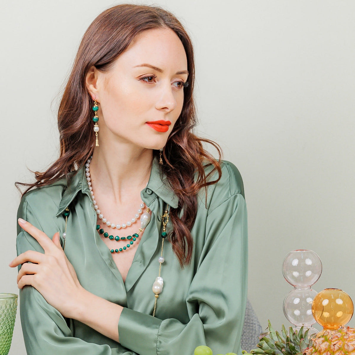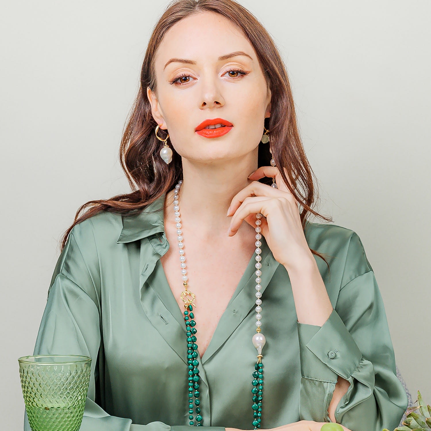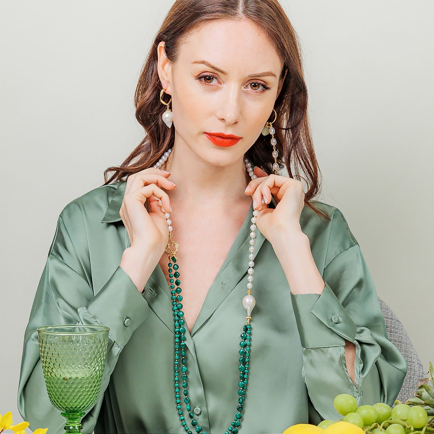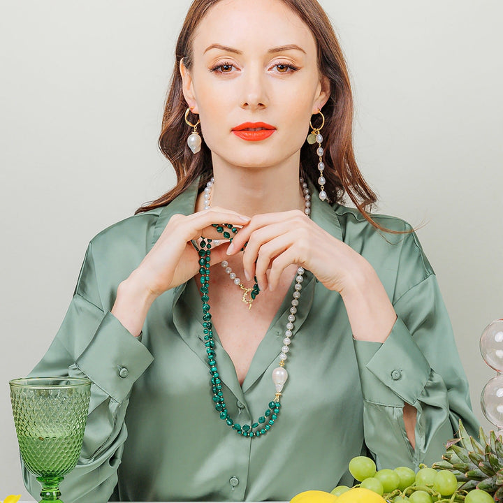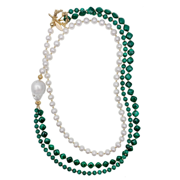 This pearl necklace is handcrafted from malachite with freshwater pearls and a baroque pearl. It has Japan gold-plated brass findings. It will be contained in a jewelry box.