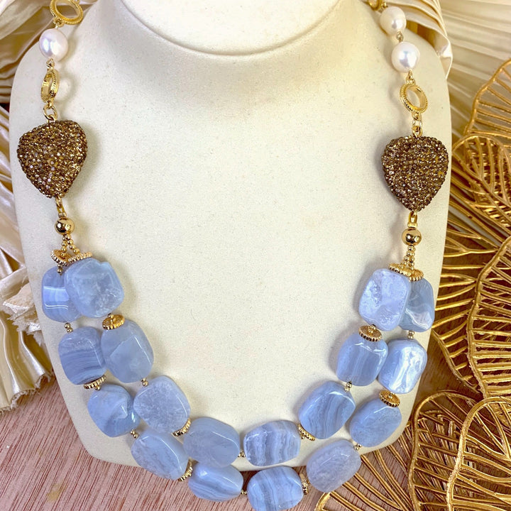 This Blue Lace Agate With Fresh Water Charm Double Layers Necklace by Farra is a beautiful and elegant accessory. This handmade necklace is made of blue lace agate with freshwater pearls with a golden-colored rhinestones heart charm and golden brass findings. It can be matched with a dress, blouse, or denim for a gorgeous look.
