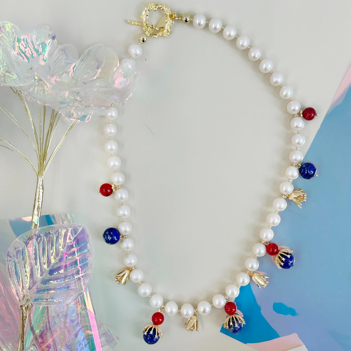 This statement necklace is crafted from natural freshwater pearls and features Lapis Lazuli and Red Coral pendants. It will be contained in a nice jewelry box.
