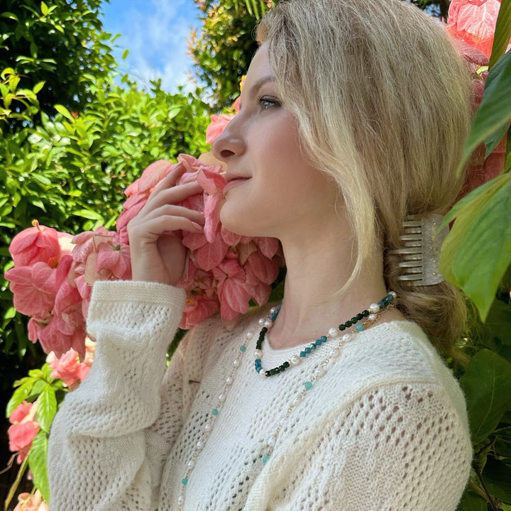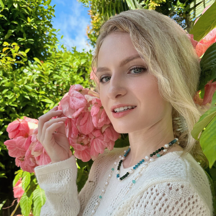 This Green & Blue Gemstone With Freshwater Pearls Necklace by Farra is an elegant and unique accessory. This necklace is crafted with natural blue apatite, green agate, and freshwater pearls. Its simple yet unique design is perfect for pairing with other pieces to create your own individual look.