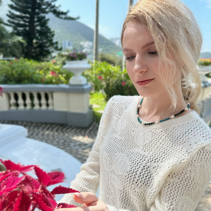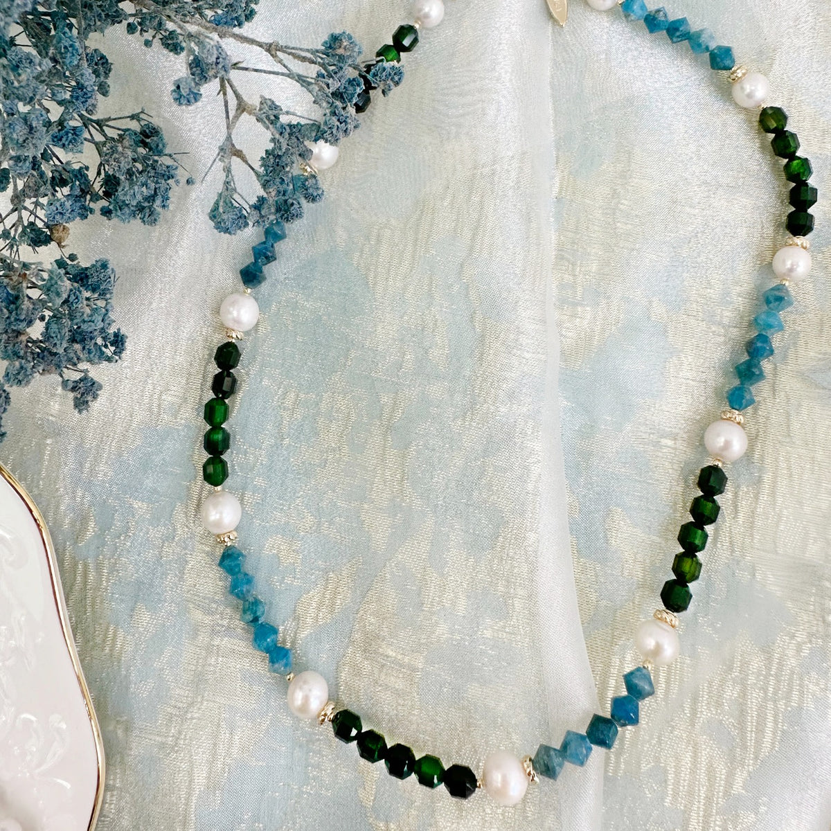 This choker necklace is crafted with natural blue apatite, green agate, and freshwater pearls. It will be contained in a nice jewelry box.