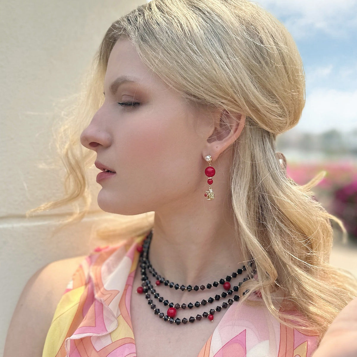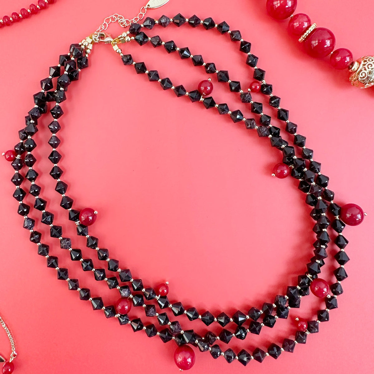 This layered necklace features multiple layers of garnet beads with a red bamboo coral pendant. It will be contained in a nice jewelry box.