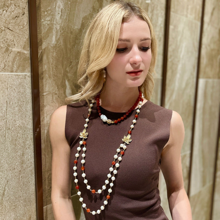 The Freshwater Pearl With Red Agate And Maple Leaves Charm Long Chain Necklace by Farra is a beautiful and feminine accessory. This handmade necklace is made of freshwater pearls with red agate, a maple leaves charm, and Japanese golden plated brass findings.