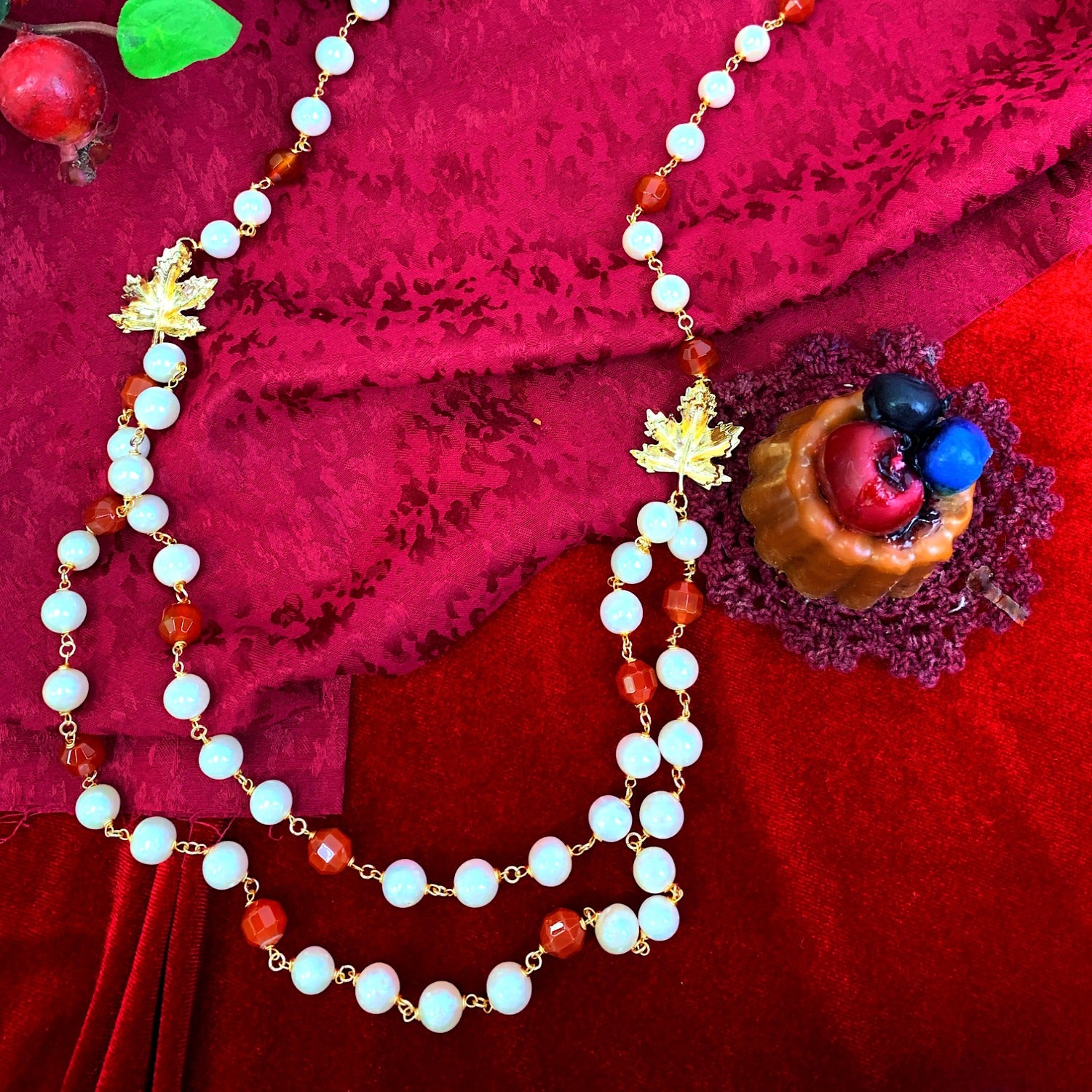 This pearl necklace is crafted with freshwater pearls, red agate, a maple leaves charm, and Japanese golden plated brass findings. It will be contained in a nice jewelry box.