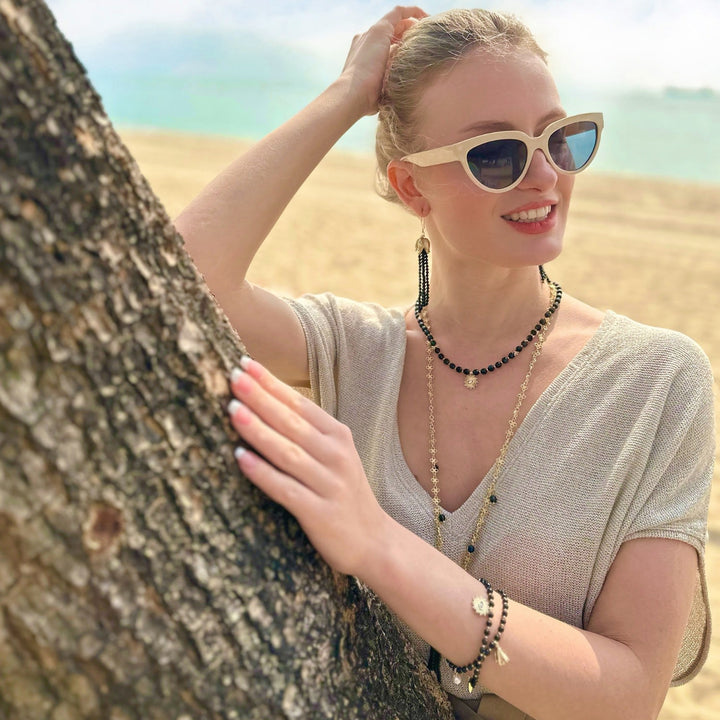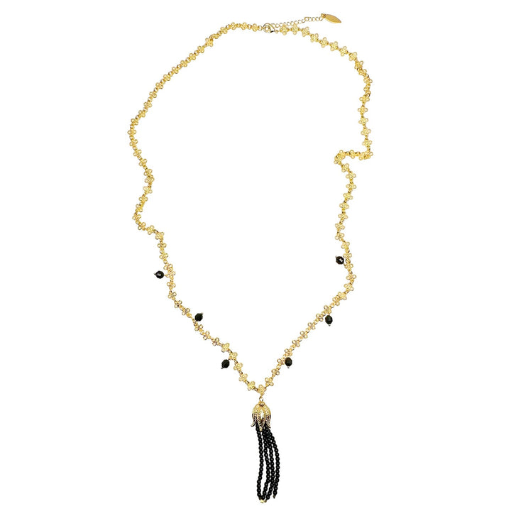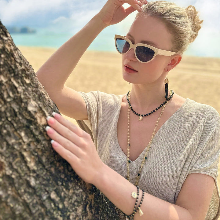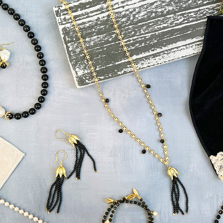 This Black Obsidian With Tassel Chain Necklace by Farra is a timeless and elegant piece. The pendant, a beautiful black obsidian stone, perfectly complements the chain, creating a harmonious and sophisticated look. This necklace is the perfect choice for anyone who loves classic, beautiful jewelry and wants to make a subtle statement.