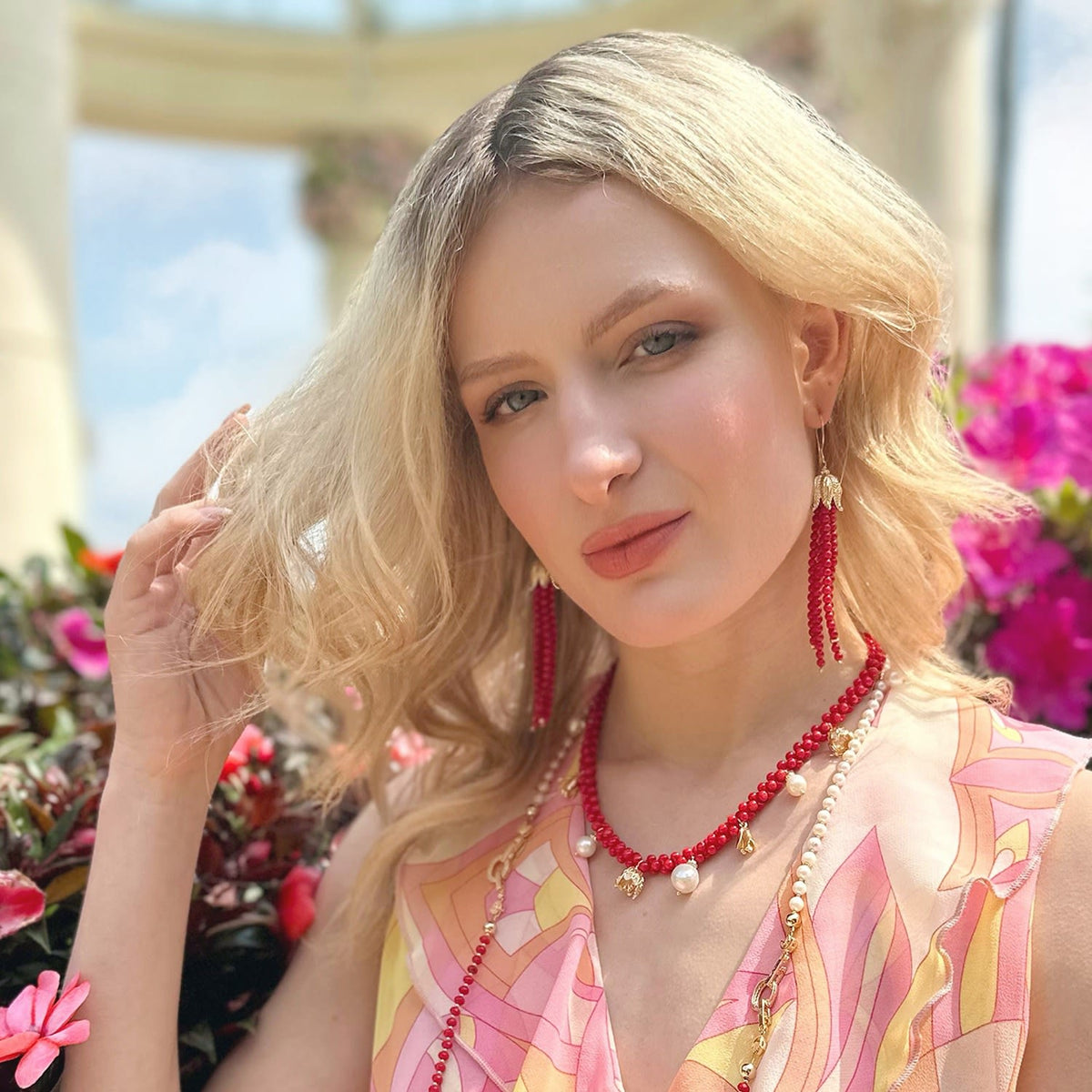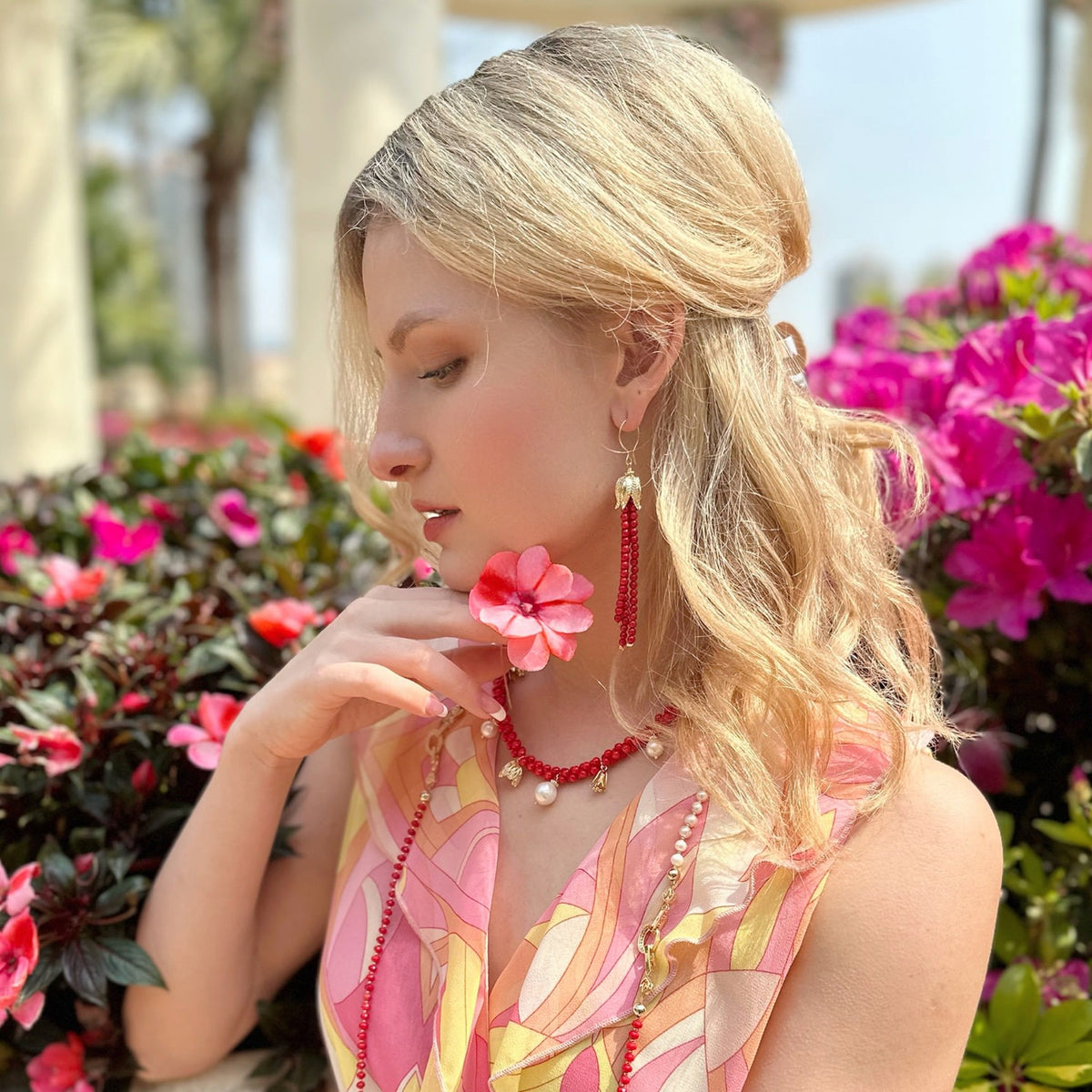 This Peanut Shaped Red Coral Statement Necklace by Farra is a beautiful addition to any jewelry collection. The natural peanut-shaped coral beads in a warm red hue add a touch of color and natural beauty to any outfit. The flower and pearls pendant provides an elegant finishing touch, making this a perfect statement piece for any occasion.