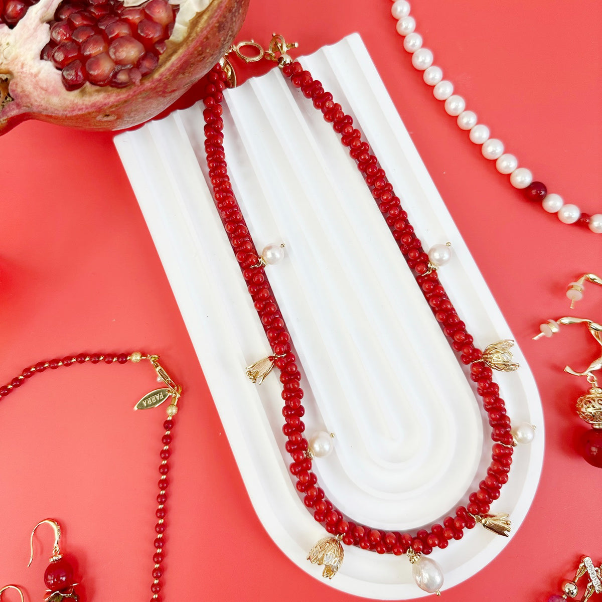 This necklace features peanut-shaped natural bamboo coral beads with a flower and pearls pendant.