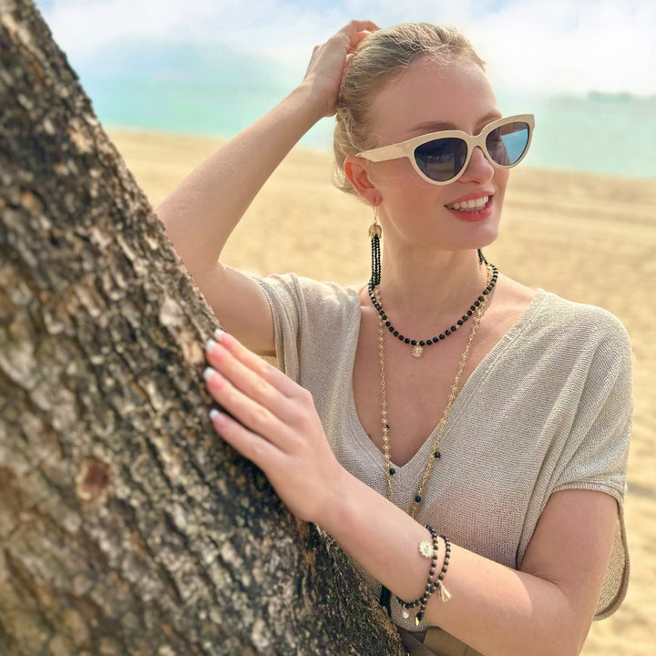 This Chain With Black Obsidian Tassel Necklace by Farra is a timeless and elegant piece. The pendant, a beautiful black obsidian stone, perfectly complements the chain, creating a harmonious and sophisticated look. This necklace is the perfect choice for anyone who loves classic, beautiful jewelry and wants to make a subtle statement.