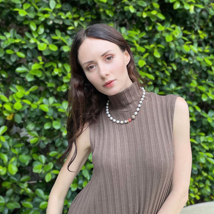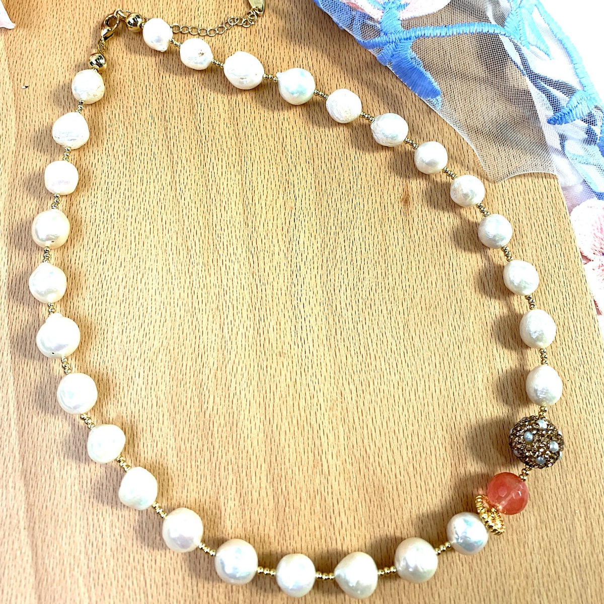 Freshwater Pearls With Watermelon Quartz & Rhinestones Short Necklace