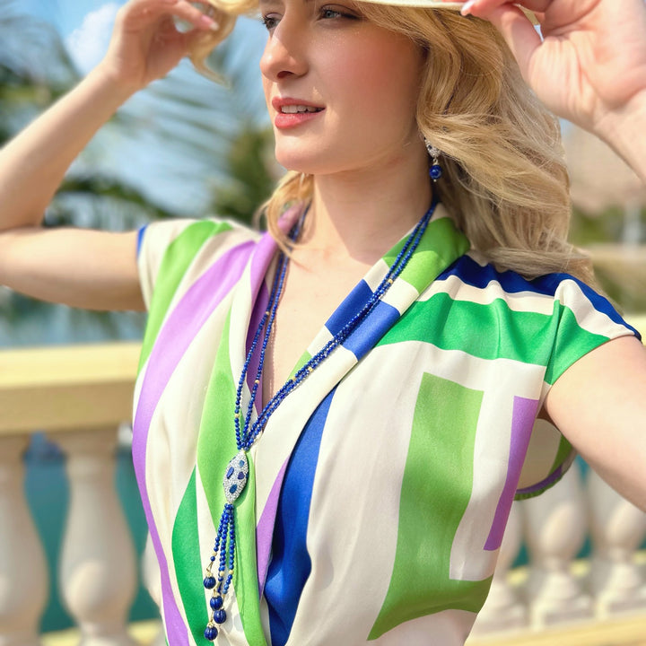 This Classic Y Shaped Lapis With Rhinestone Necklace by Farra is a beautiful and modern piece. The Y shape elongates the neck and creates a dramatic look. It is carefully handcrafted and features an adjustable 2-inch extender for the perfect fit, making it an excellent gift for a fashionista.