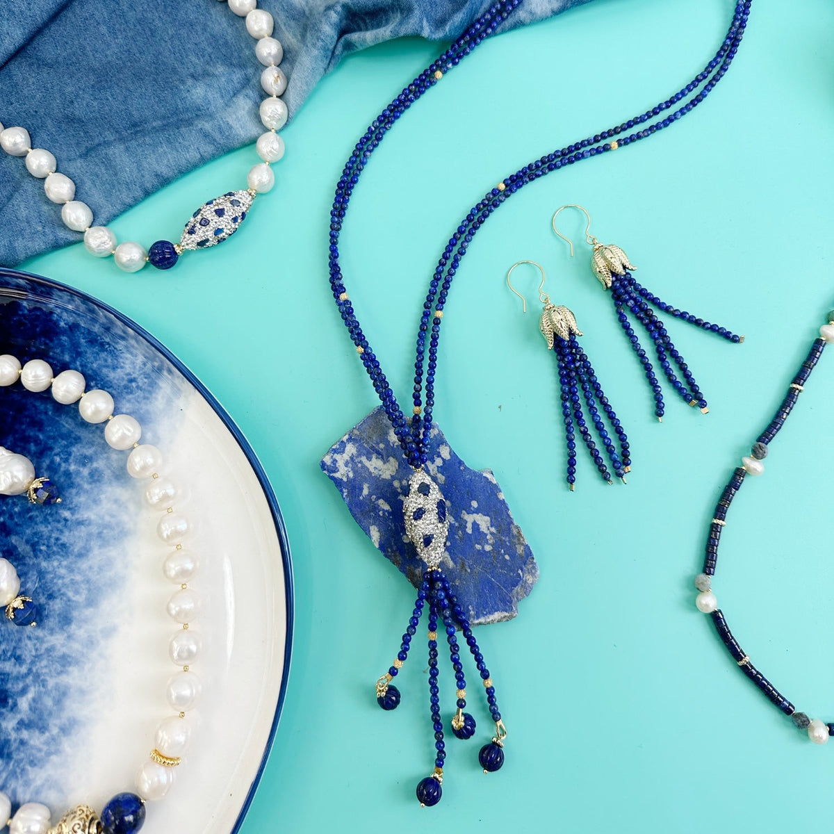 Classic Y Shaped Lapis With Rhinestone Necklace