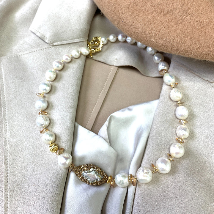 This short necklace is handmade with irregular freshwater pearls, yellow crystals, and rhinestones. It is made with Japan golden-plated brass findings.
