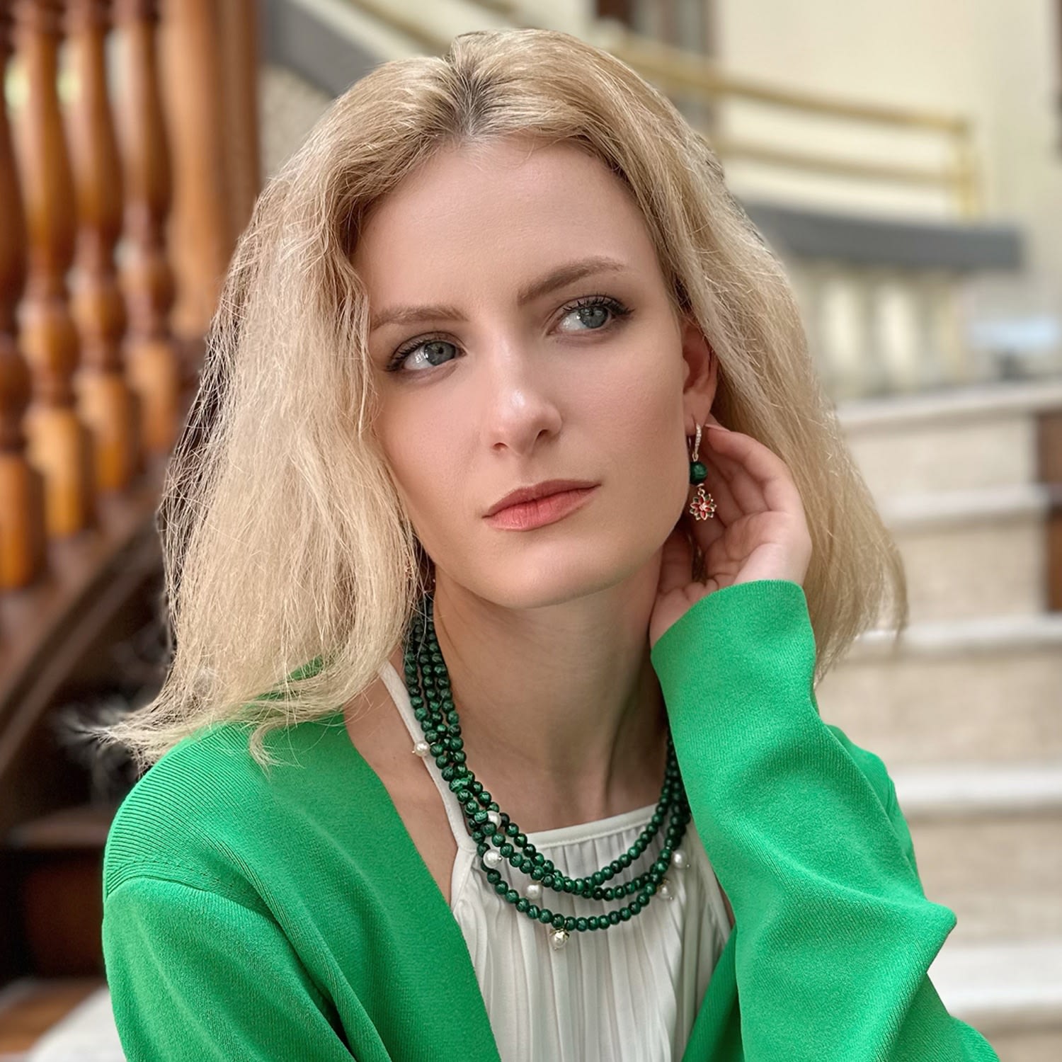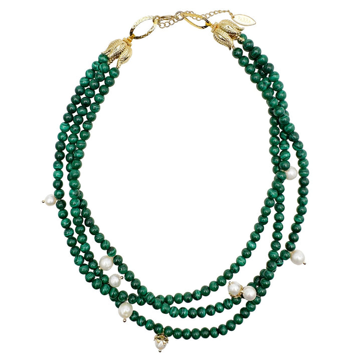 This layered necklace features malachite, freshwater pearls, and has three strands.