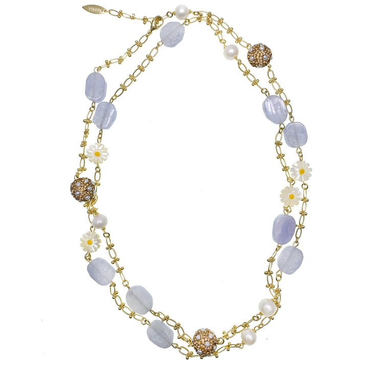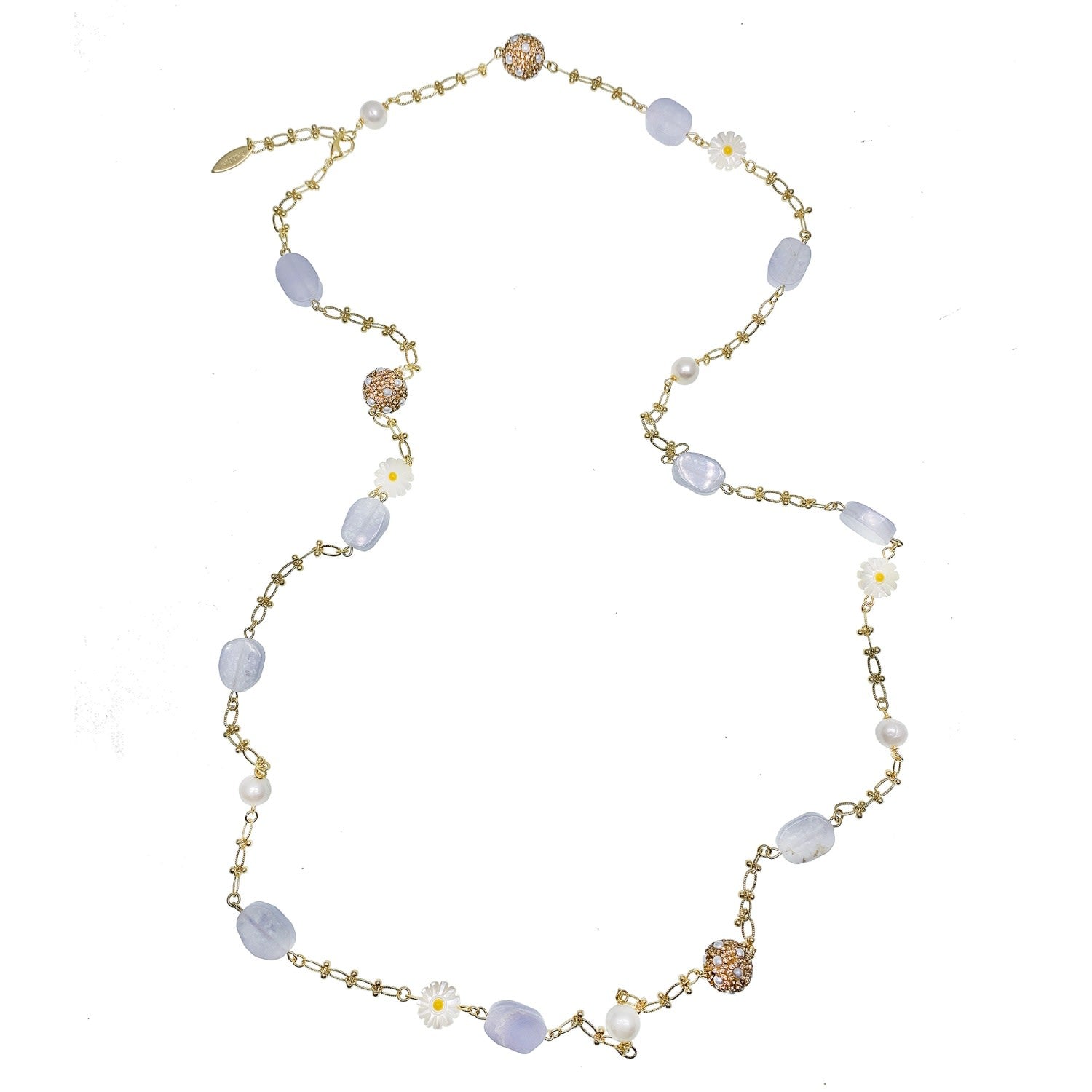 This chain necklace is made with blue lace agate with a sunflower shell, rhinestones bordered pearls, and Japan golden-plated brass findings. It can be worn as a long single or double-wrapped necklace.