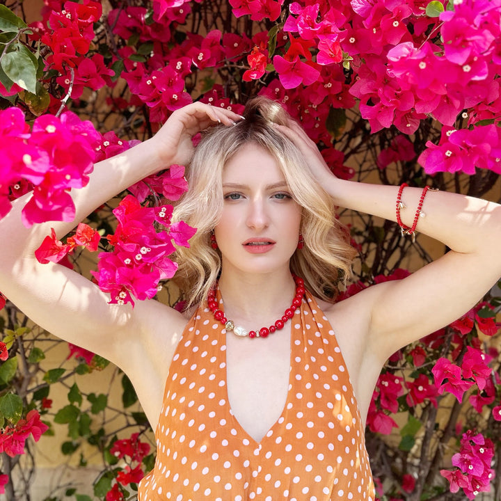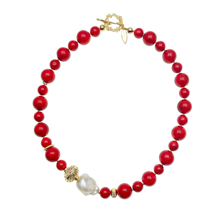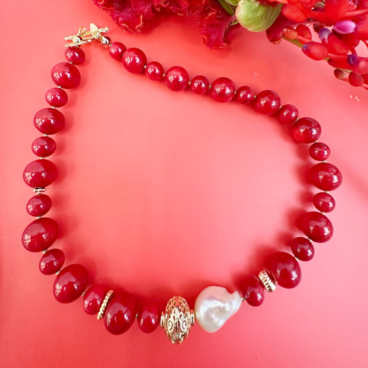 This Red Coral With Baroque Pearl Statement Necklace by Farra is an exquisite statement piece. It features large, chunky bamboo coral stones in a beautiful deep red color, interspersed with lustrous baroque pearls in varying sizes. Each coral bead has its own unique organic pattern, adding a touch of elegance and sophistication to any outfit.