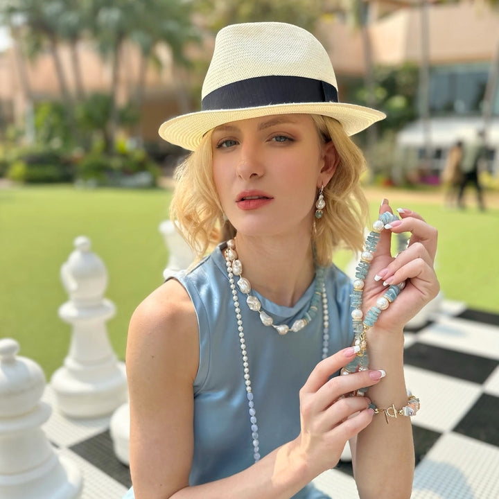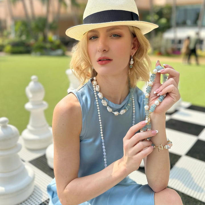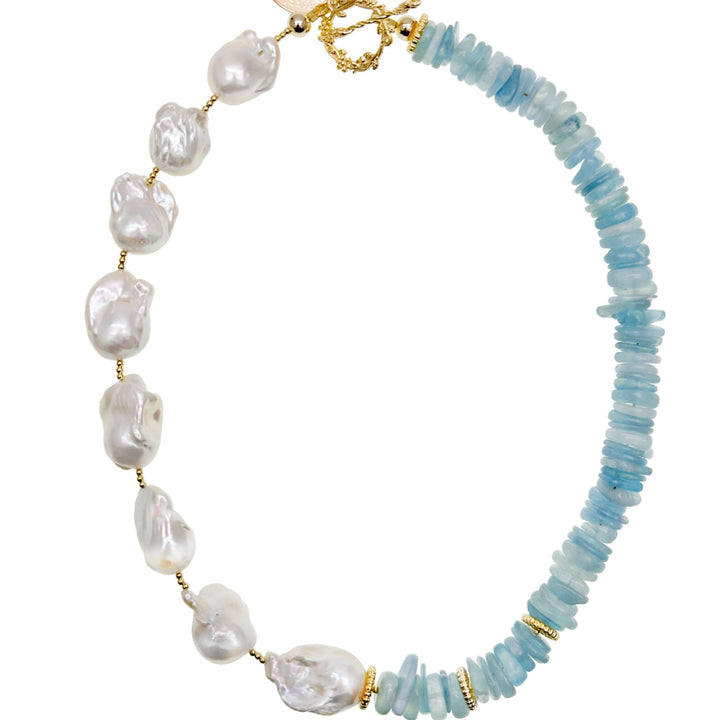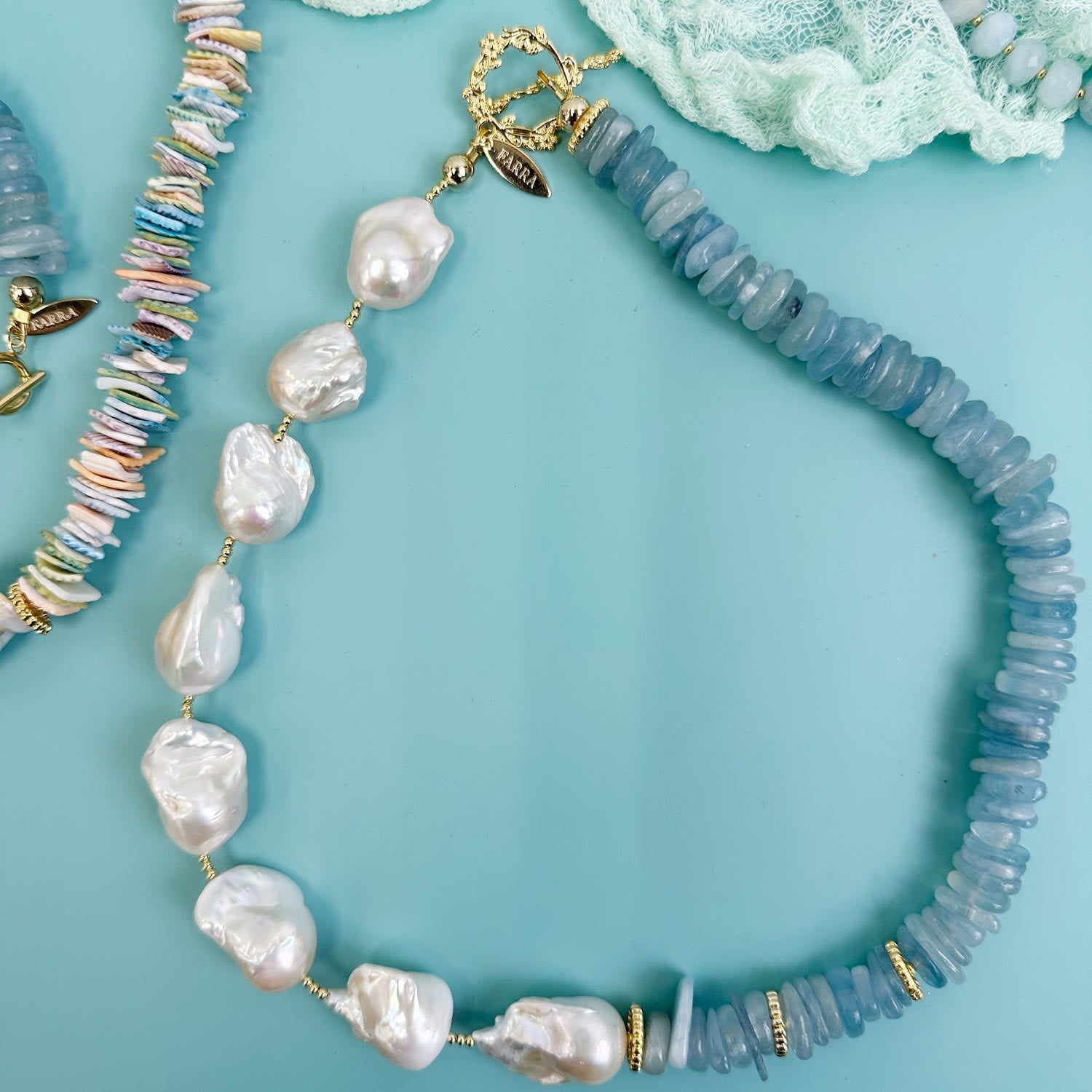 This pearl necklace features baroque pearls and aquamarine gemstones.