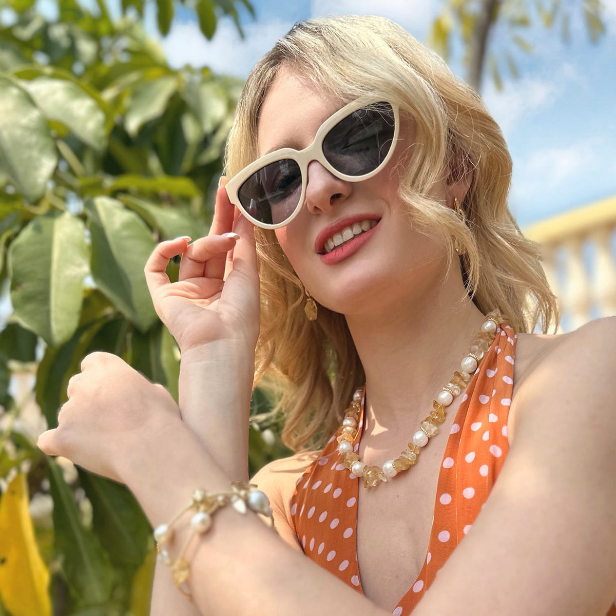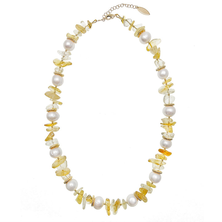 This pearl necklace features citrine stones, freshwater pearls, and Japan golden-plated brass findings. It's a short necklace.