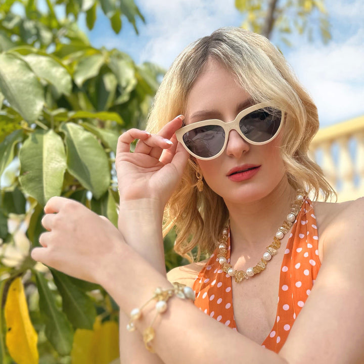 This Citrine Stones & Freshwater Pearls Short Necklace by Farra is a beautiful pearl necklace that is perfect for daily wear. It features citrine stones and freshwater pearls with Japan golden-plated brass findings. Citrine is believed to attract abundance and prosperity, making this a beautiful and meaningful accessory.
