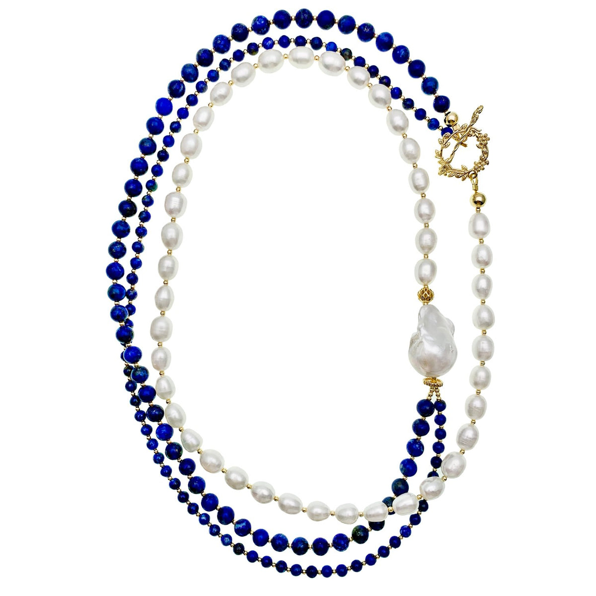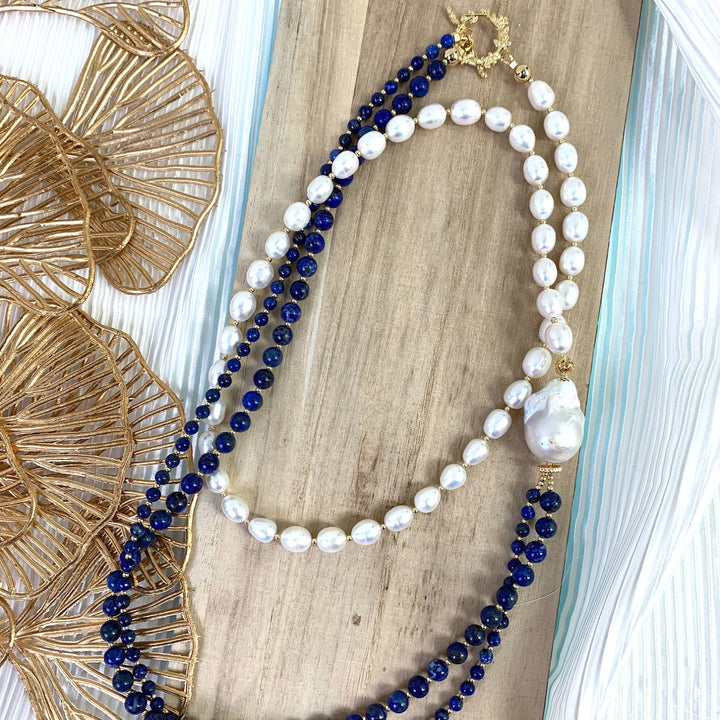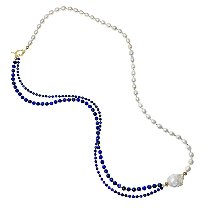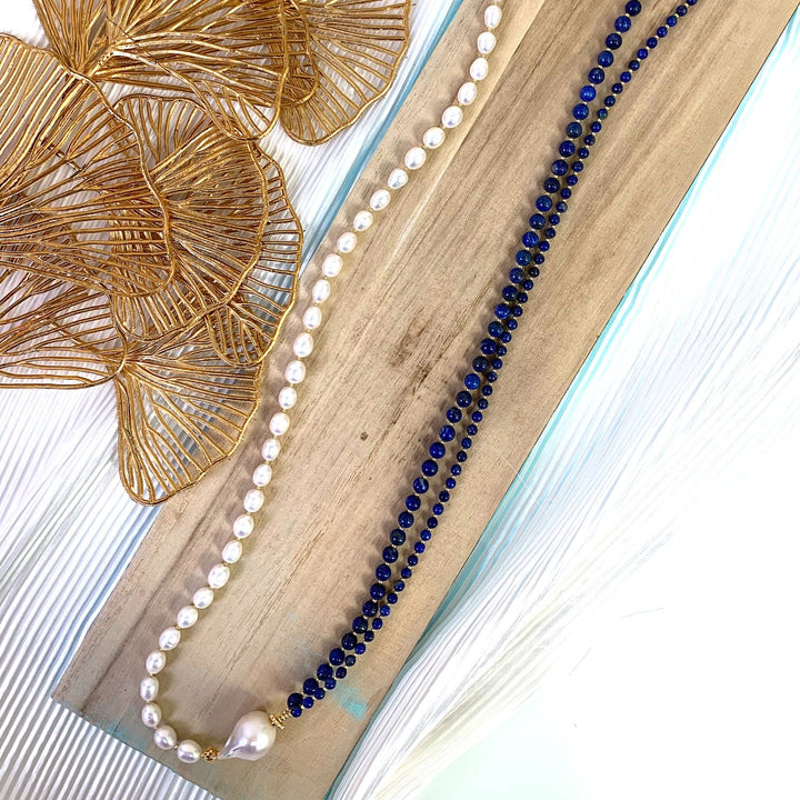 This long layered necklace is made of round lapis, freshwater pearls, and Baroque Pearl with golden-plated brass findings.