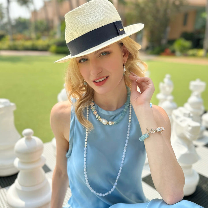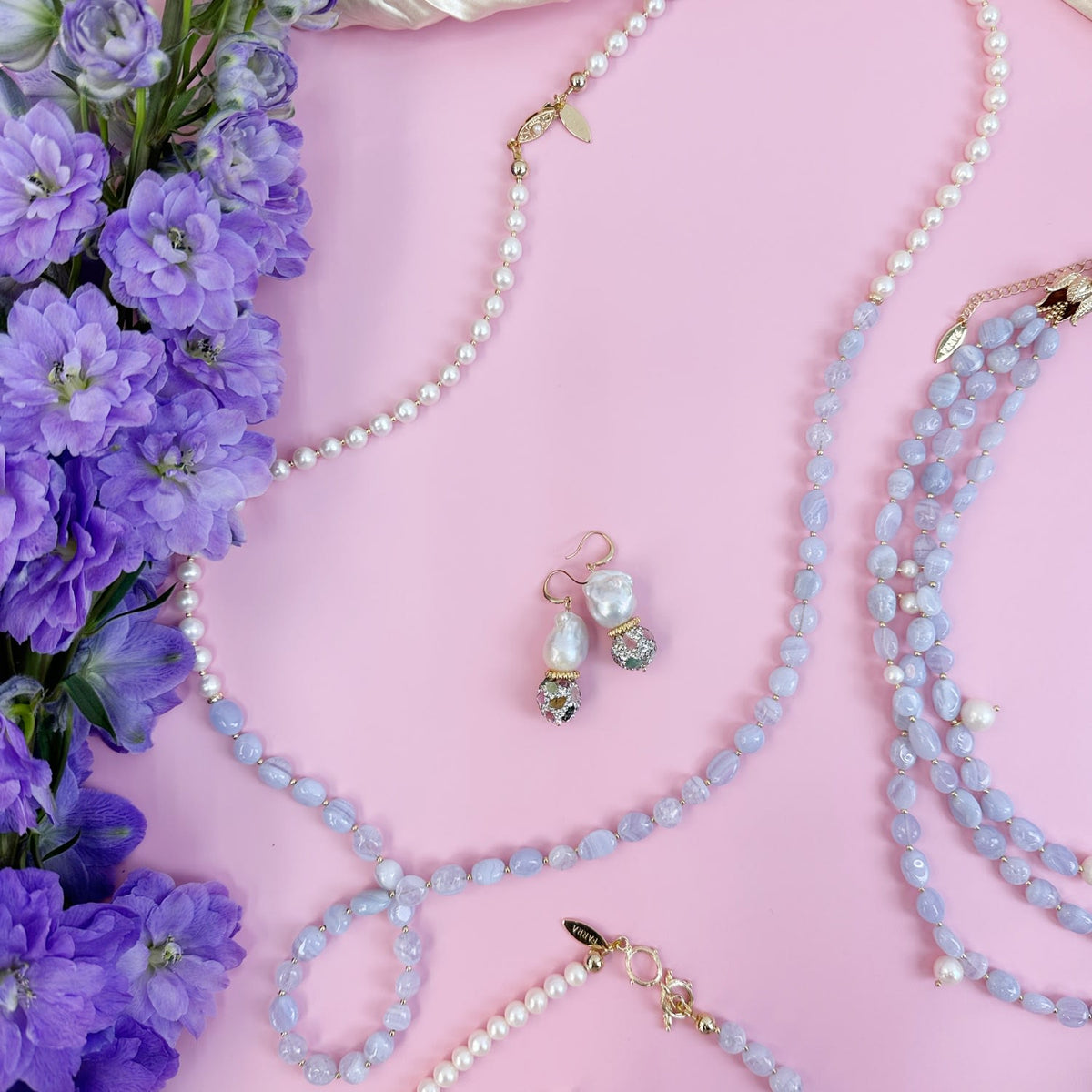 This White Freshwater Pearls And Blue Lace Agate Long Necklace by Farra is a durable and multi-way necklace. It can be worn long or doubled up for a shorter, layered look. The combination of lustrous freshwater pearls and the soft blue hues of the agate creates a harmonious and graceful aesthetic that will complement any outfit.