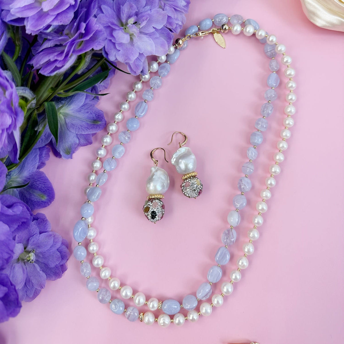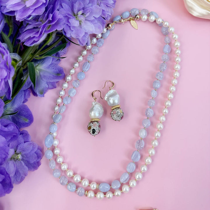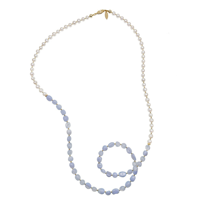 White Freshwater Pearls And Blue Lace Agate Long Necklace