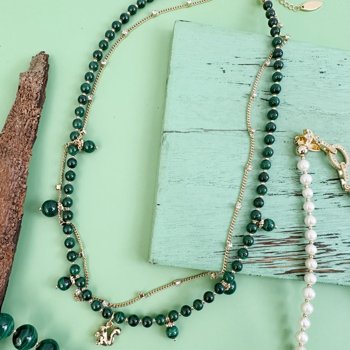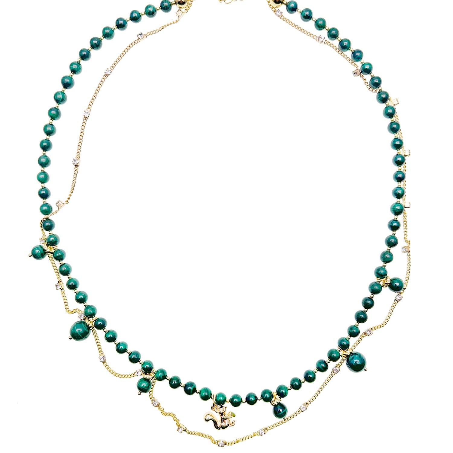 This necklace features a natural malachite stone and a squirrel pendant on a 14k gold-plated brass chain.