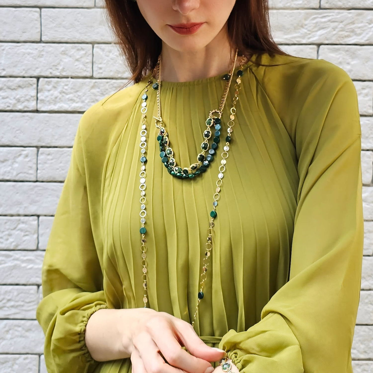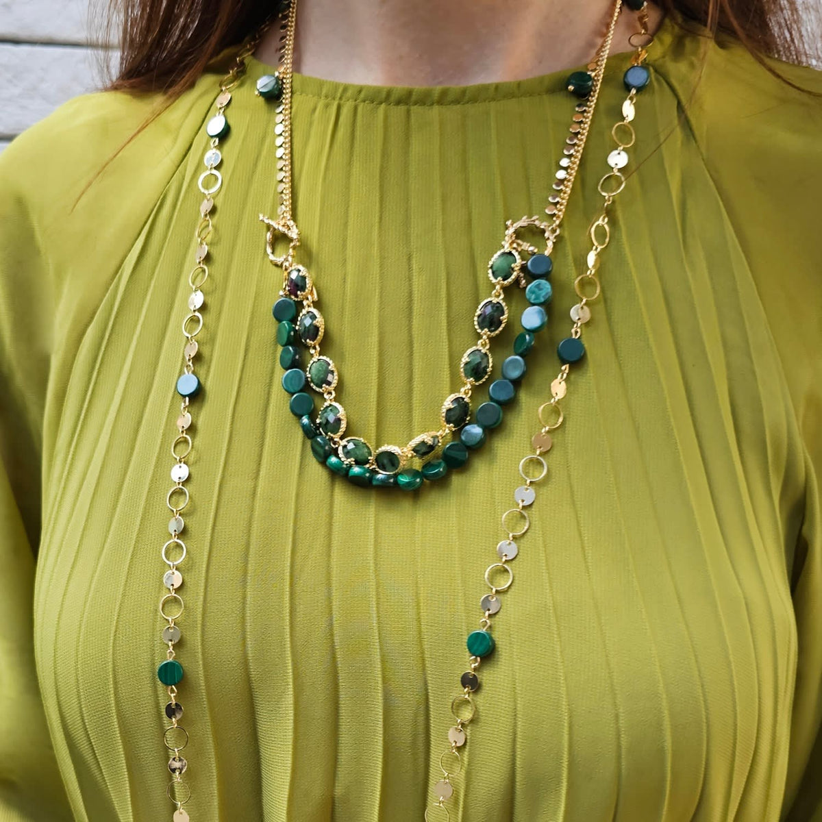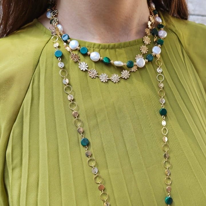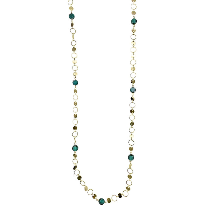 This long necklace is crafted from a gold-plated brass chain and features natural malachite beads.