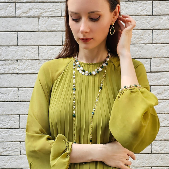 This Modern Style Chain With Malachite Long Necklace by Farra is a striking statement piece that combines contemporary style with the rich beauty of nature. A luxurious gold chain is punctuated by stunning malachite beads, known for their vibrant green hues and protective properties. This versatile necklace is perfect for a chic, standalone look or for layering, making it both stylish and meaningful.