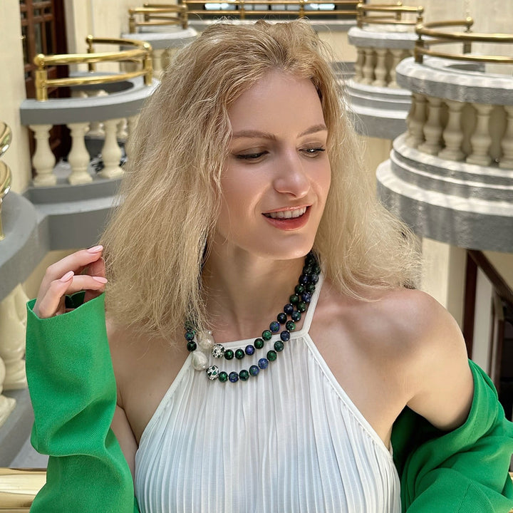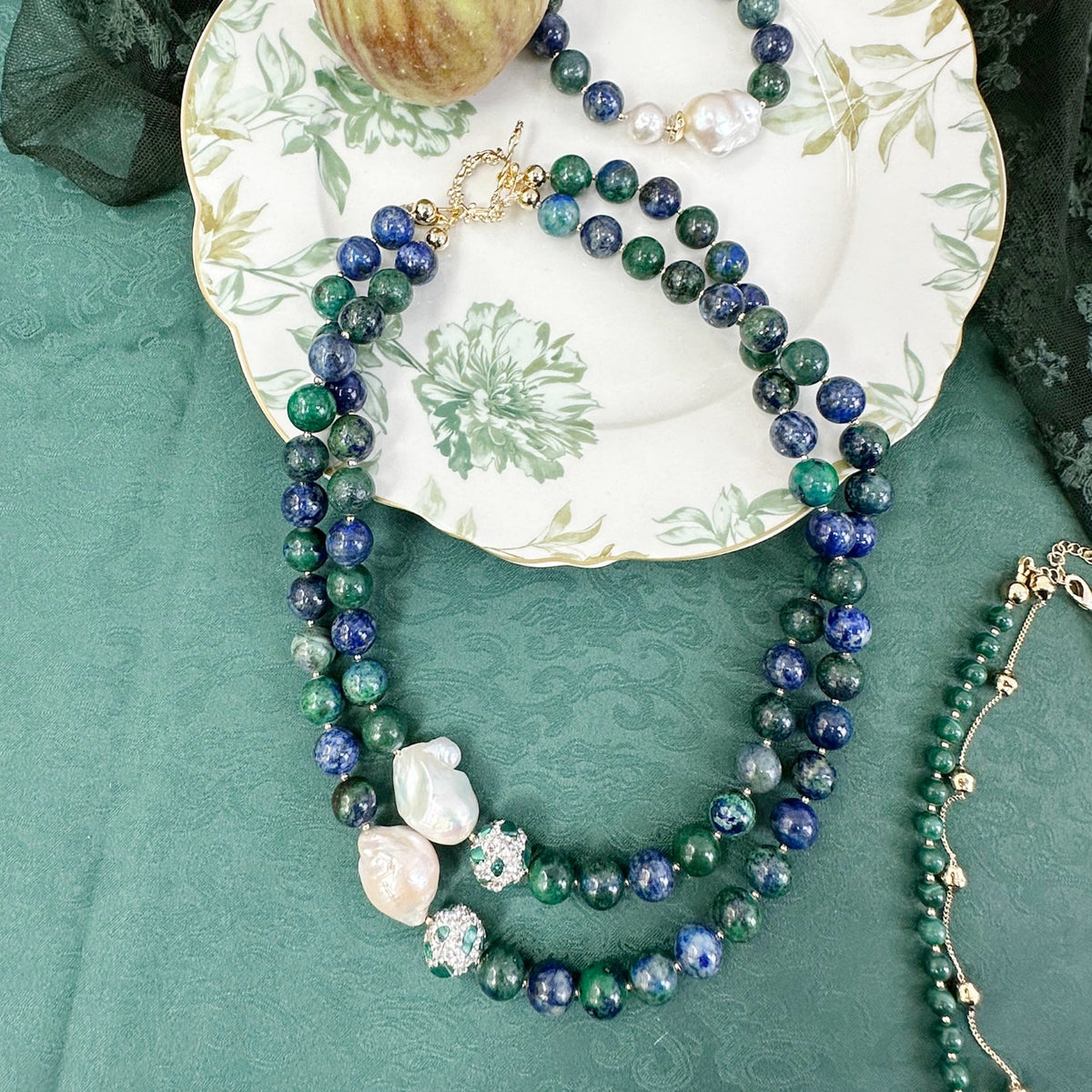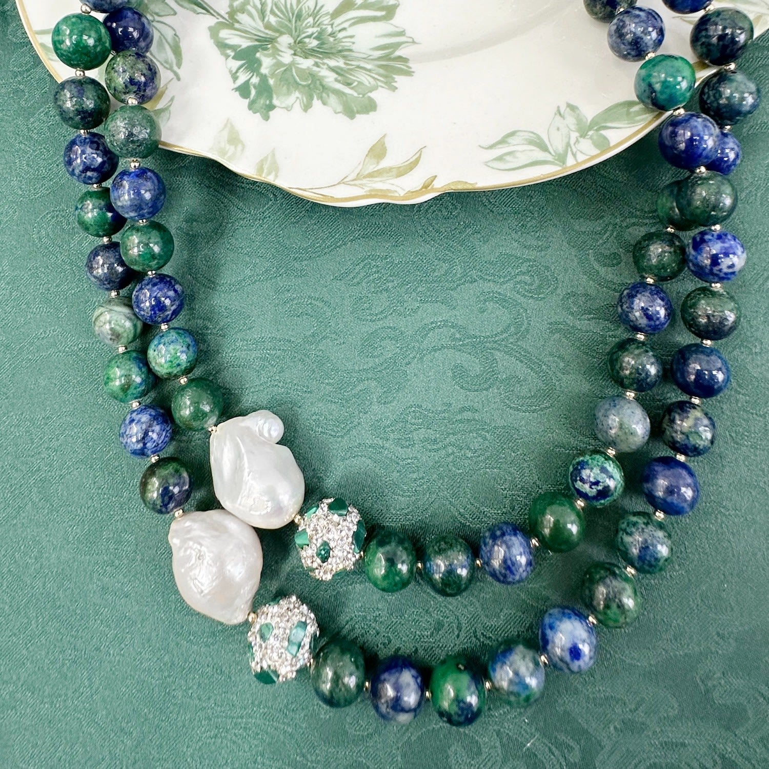 This handmade necklace is composed of Phoenix Lapis focal stones, baroque pearls, rhinestones, and malachite.