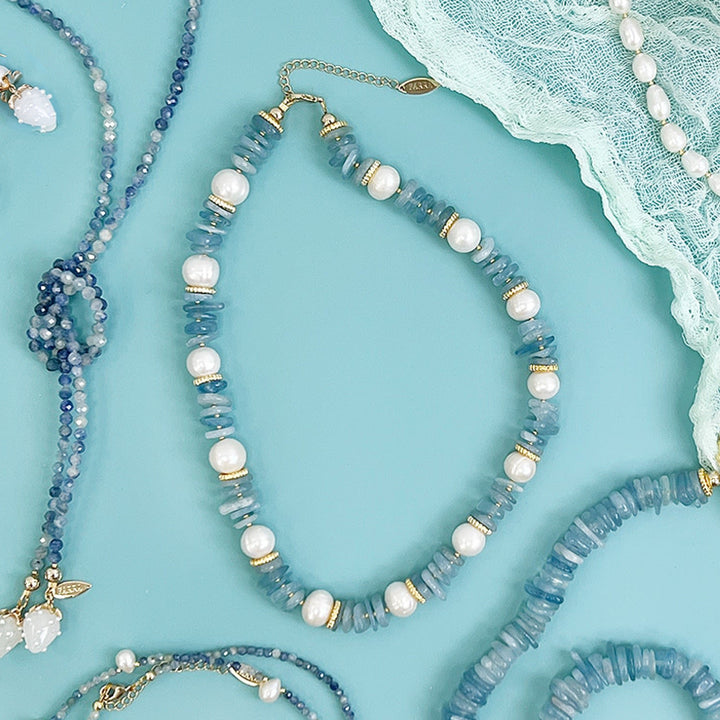 This short necklace is crafted with baroque pearls and aquamarine gemstones. The metal is not specified.