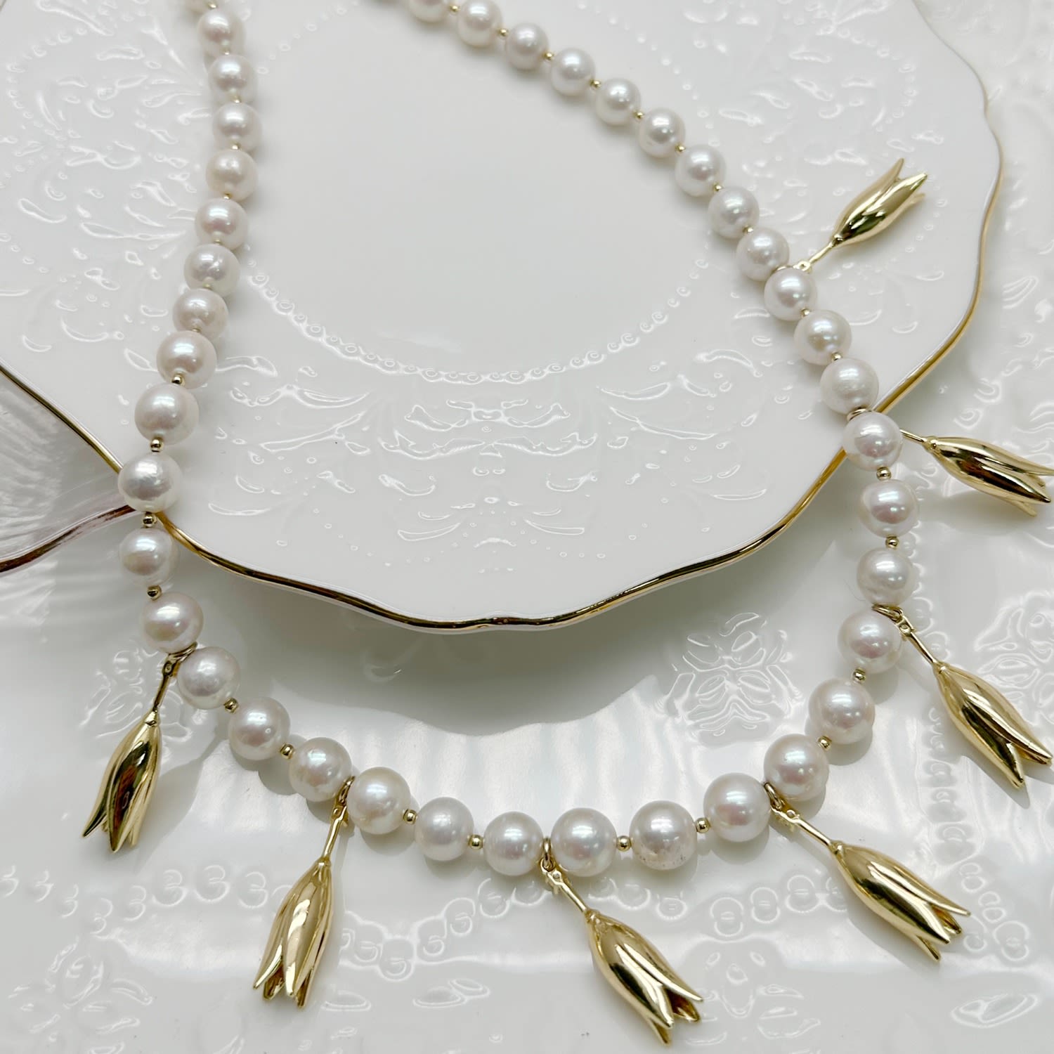 This short necklace is made with freshwater pearls and 14-karat gold plated brass flower charms.