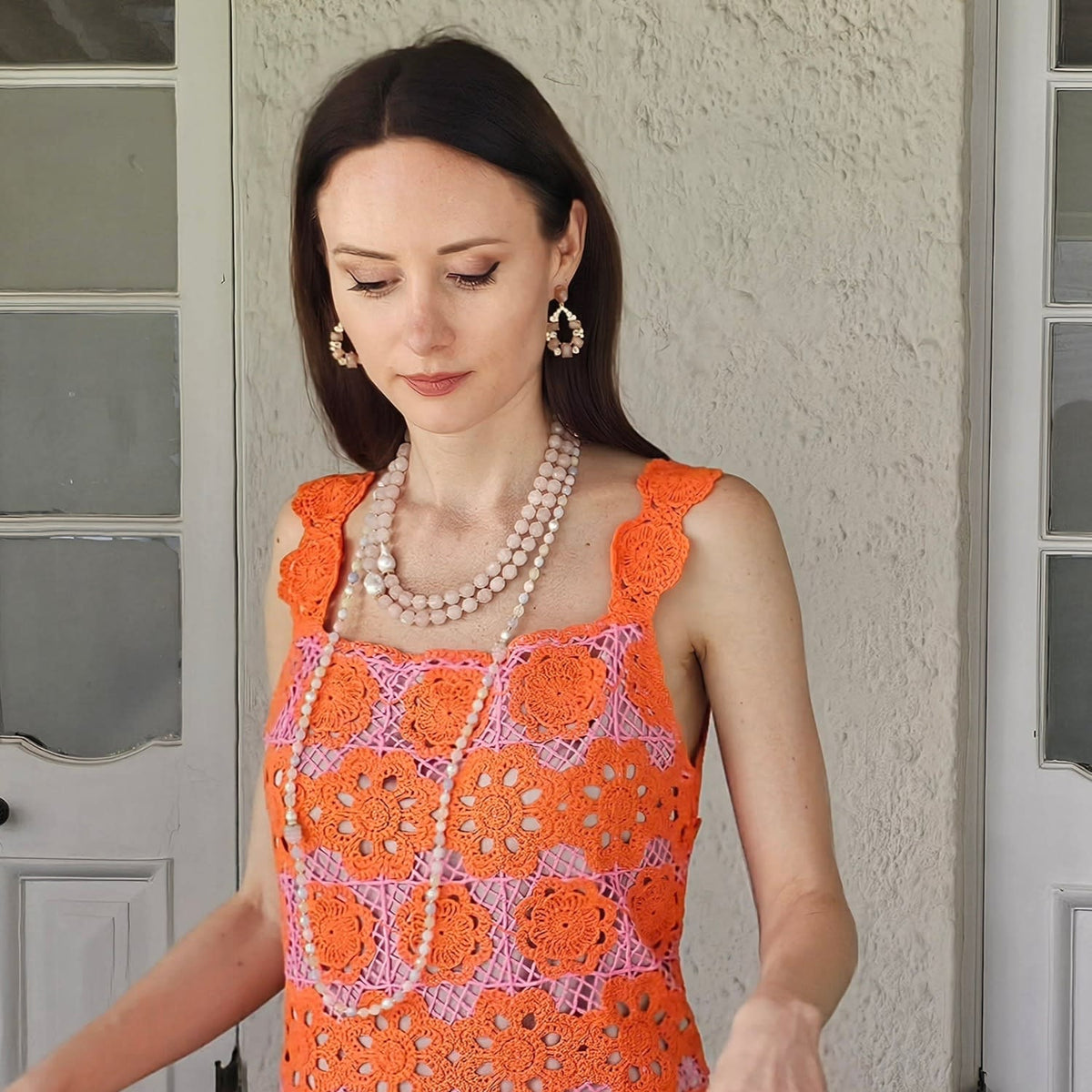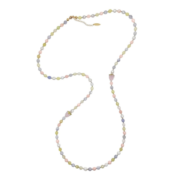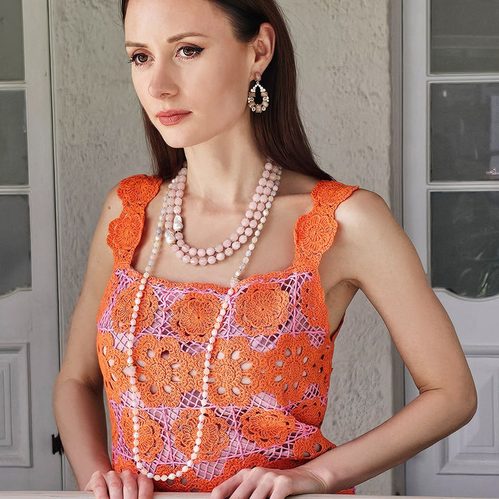 This Morganite With Pink Raspberry Long Necklace by Farra features a harmonious blend of soft morganite hues and vibrant pink raspberry gemstones. The pastel colors create a delicate yet striking visual effect, perfect for brightening up your summer wardrobe. Its long length can be worn in various styles, making it a must-have statement piece.
