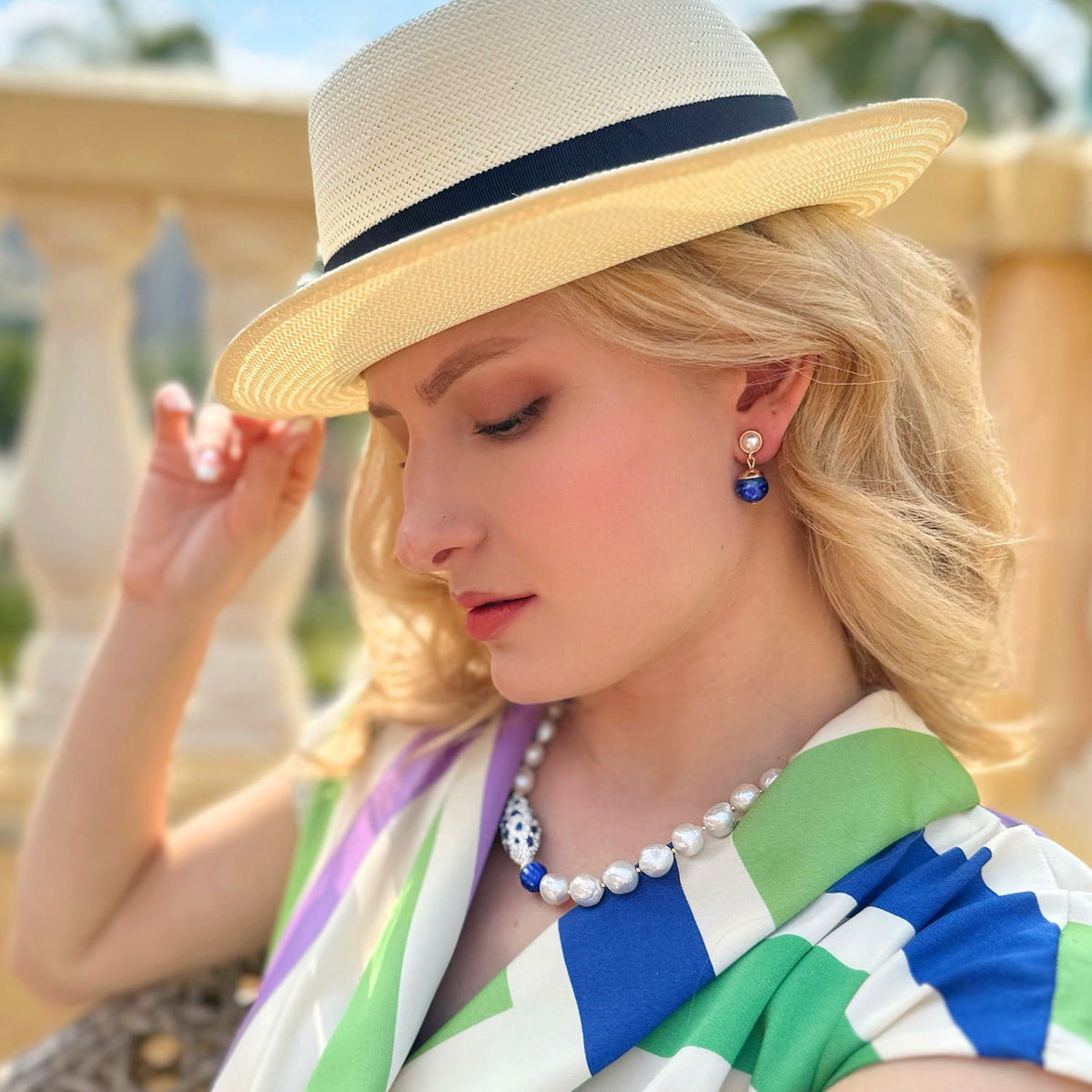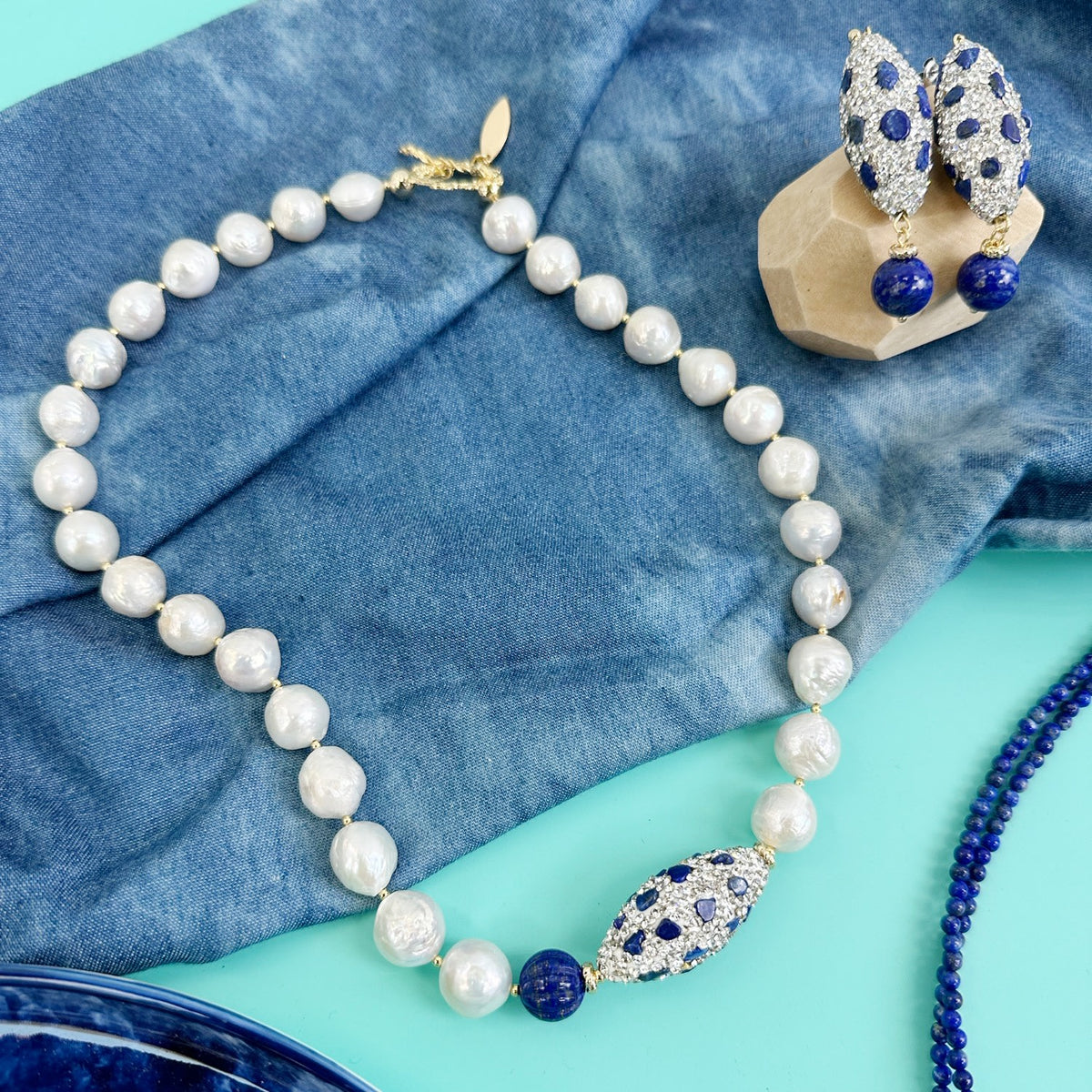 This necklace features natural freshwater pearls and lapis rhinestone beads.