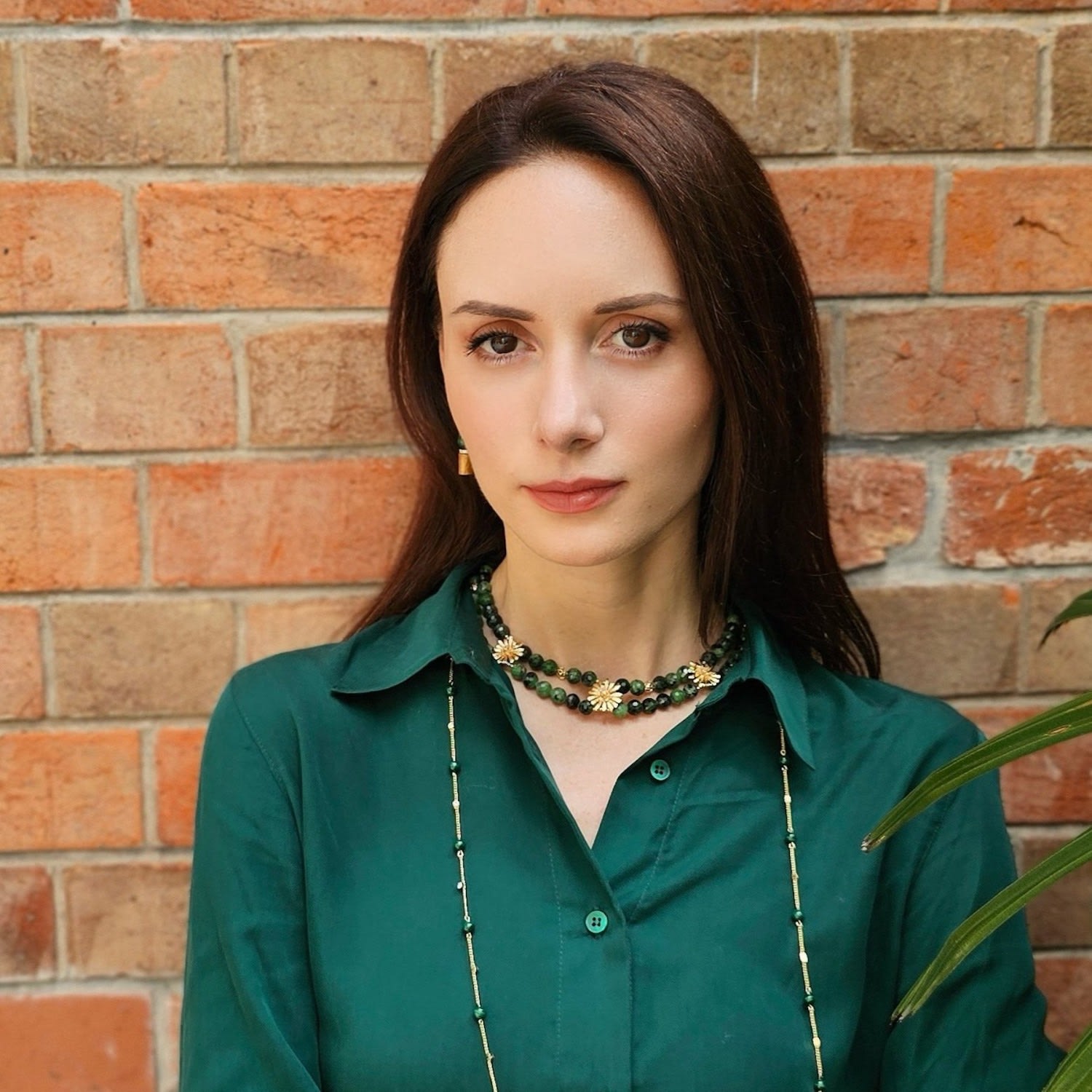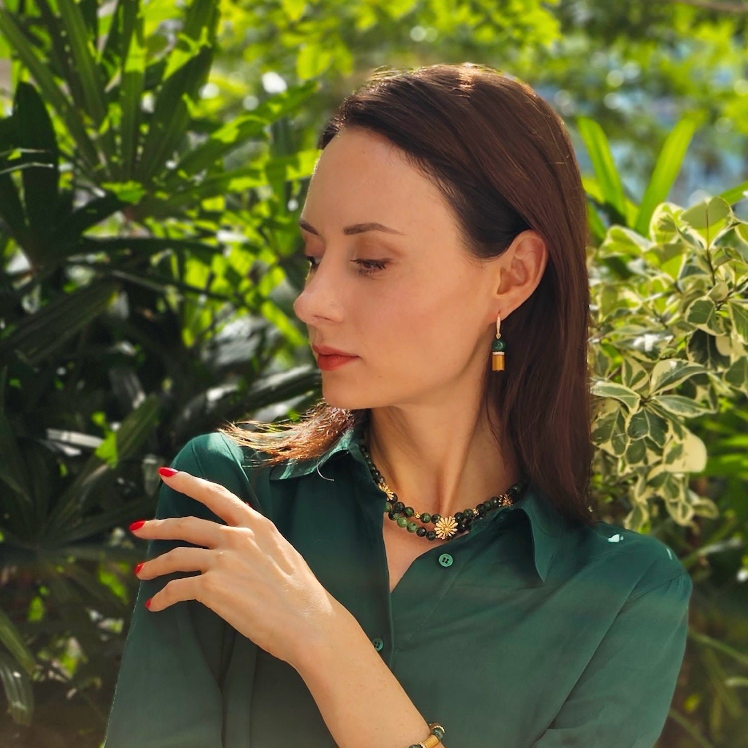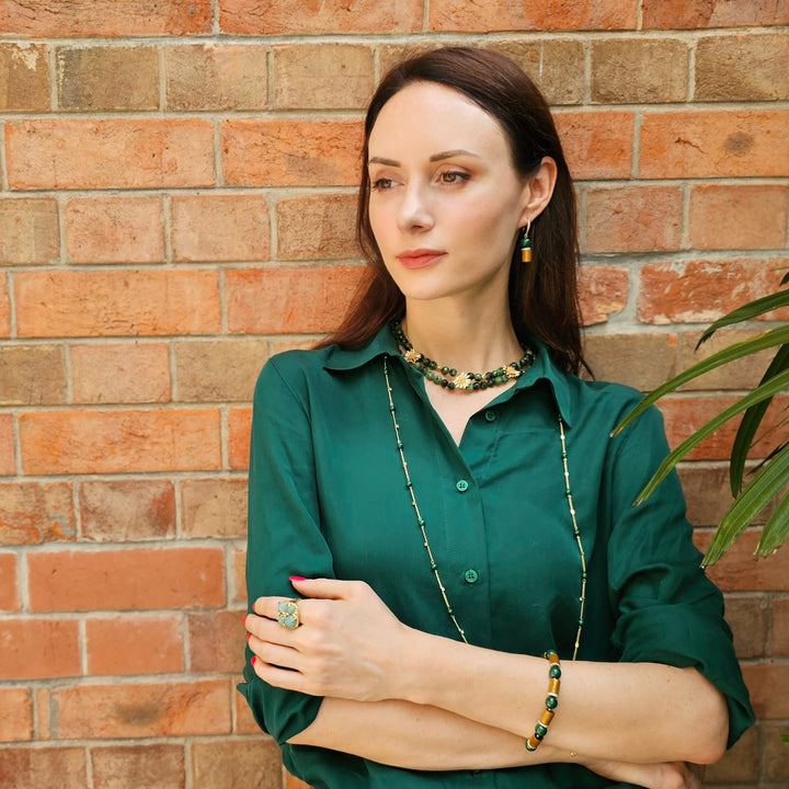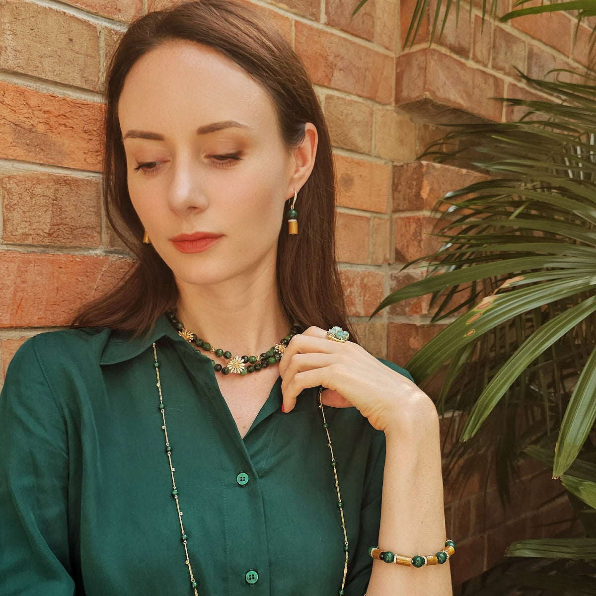 This Green Gemstone With Daisy Flower Statement Necklace by Farra is a wearable work of art. Featuring vibrant green zoisite stones, known for their rich color variations, this necklace is a true statement piece. The delicate daisy flower embellishments add a touch of whimsy and charm, creating a harmonious contrast that celebrates the beauty of nature.