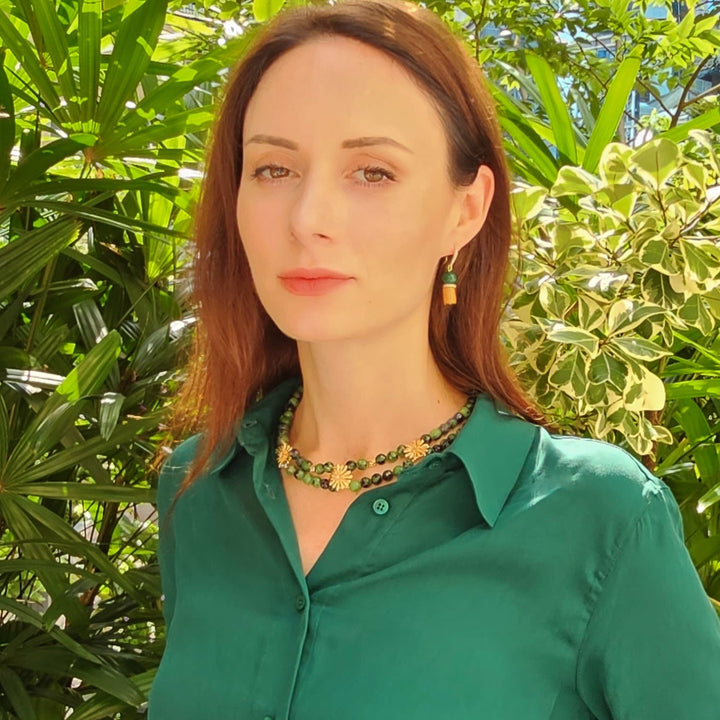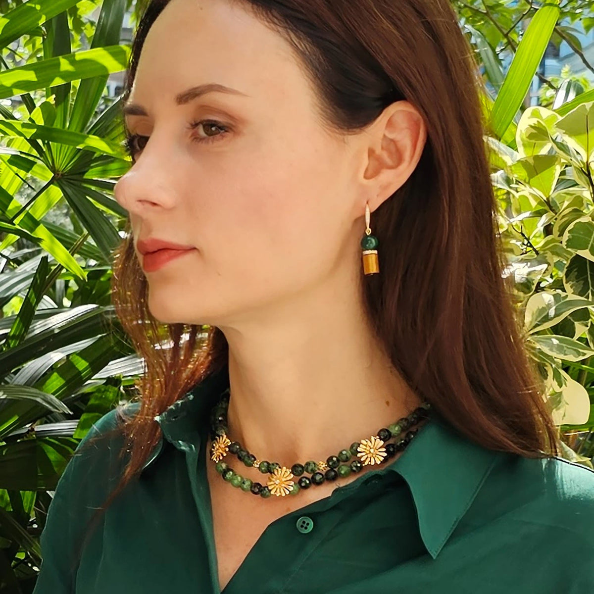 This necklace features natural zoisite stones and daisy flower embellishments crafted from 14-karat gold-plated brass.